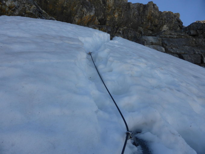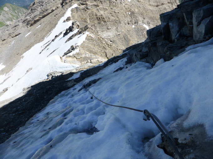 Auf der Höhe von ca. 3000 m hat es noch Schnee. Die Spur war um 11.00 Uhr noch gefroren, der Aufstieg in den vorhandenen Spuren war trotzdem problemlos. Die Fixseile konnten für die Sicherung verwendet werden. Dort, wo das Fixseil tief unter dem Schnee liegt, wurde über den Schnee ein Bergseil zur Sicherung gespannt. Somit ist ein sicherer Aufstieg bis auf den Gipfel trotz Schneestellen problemlos möglich.