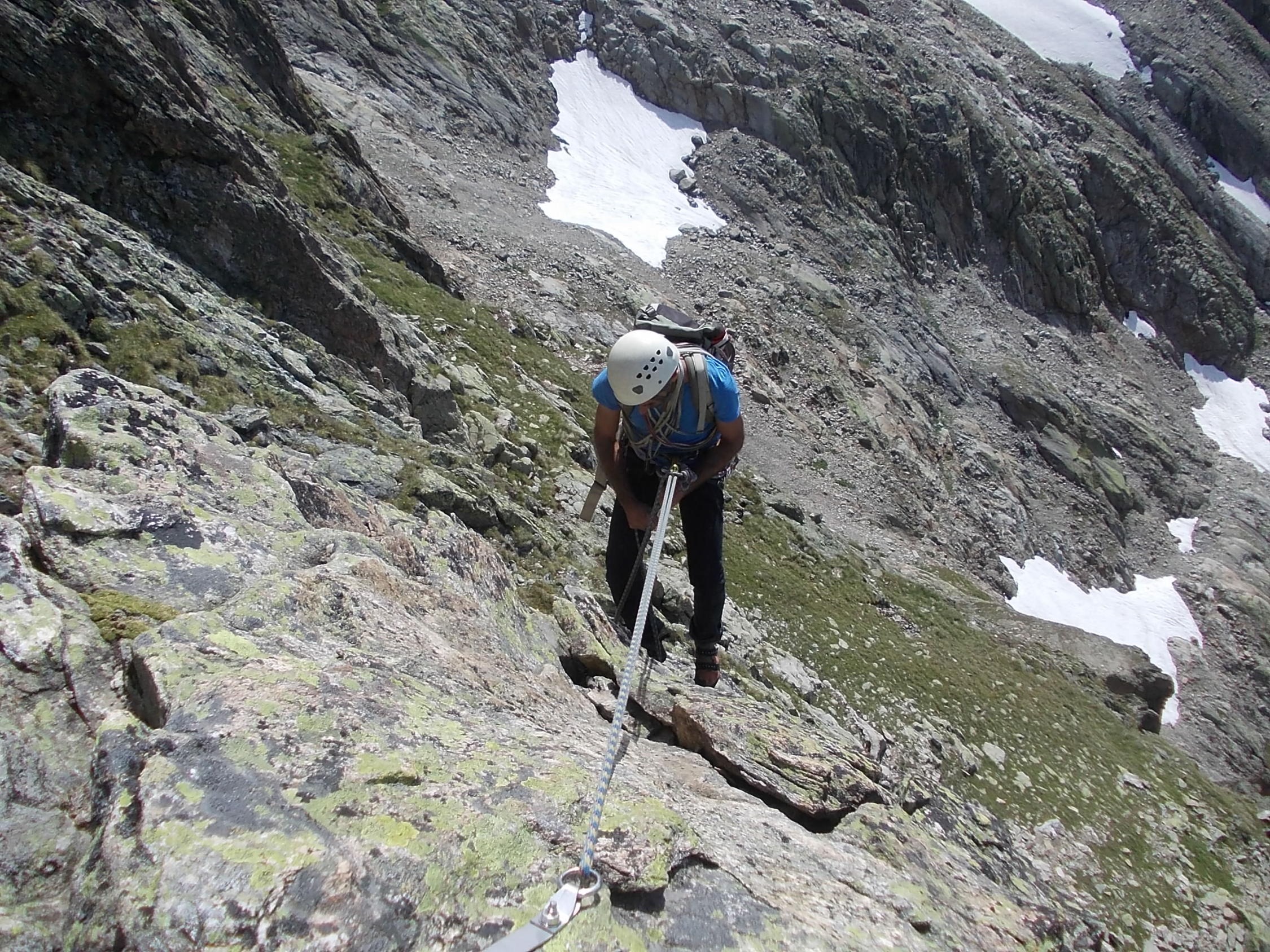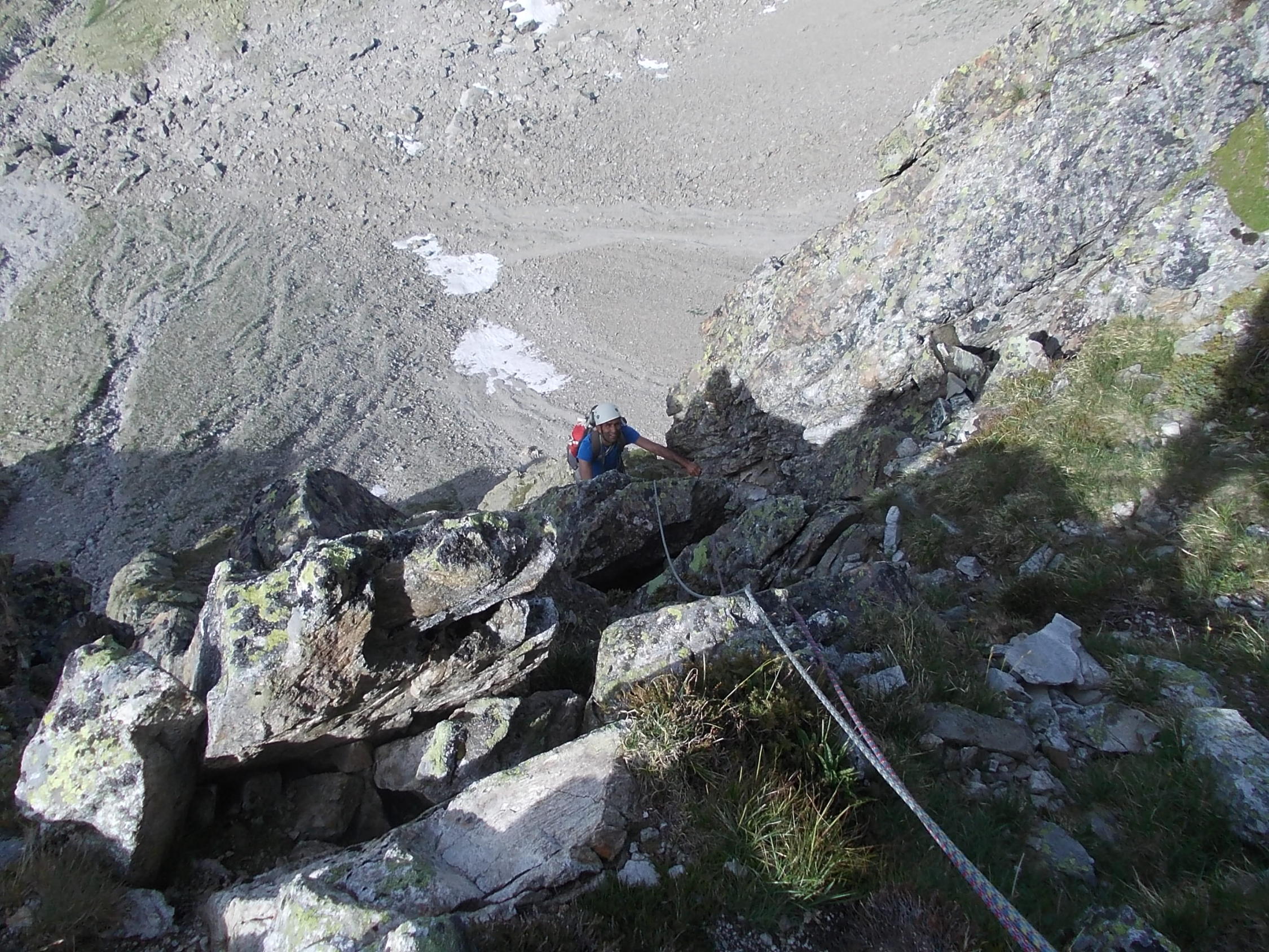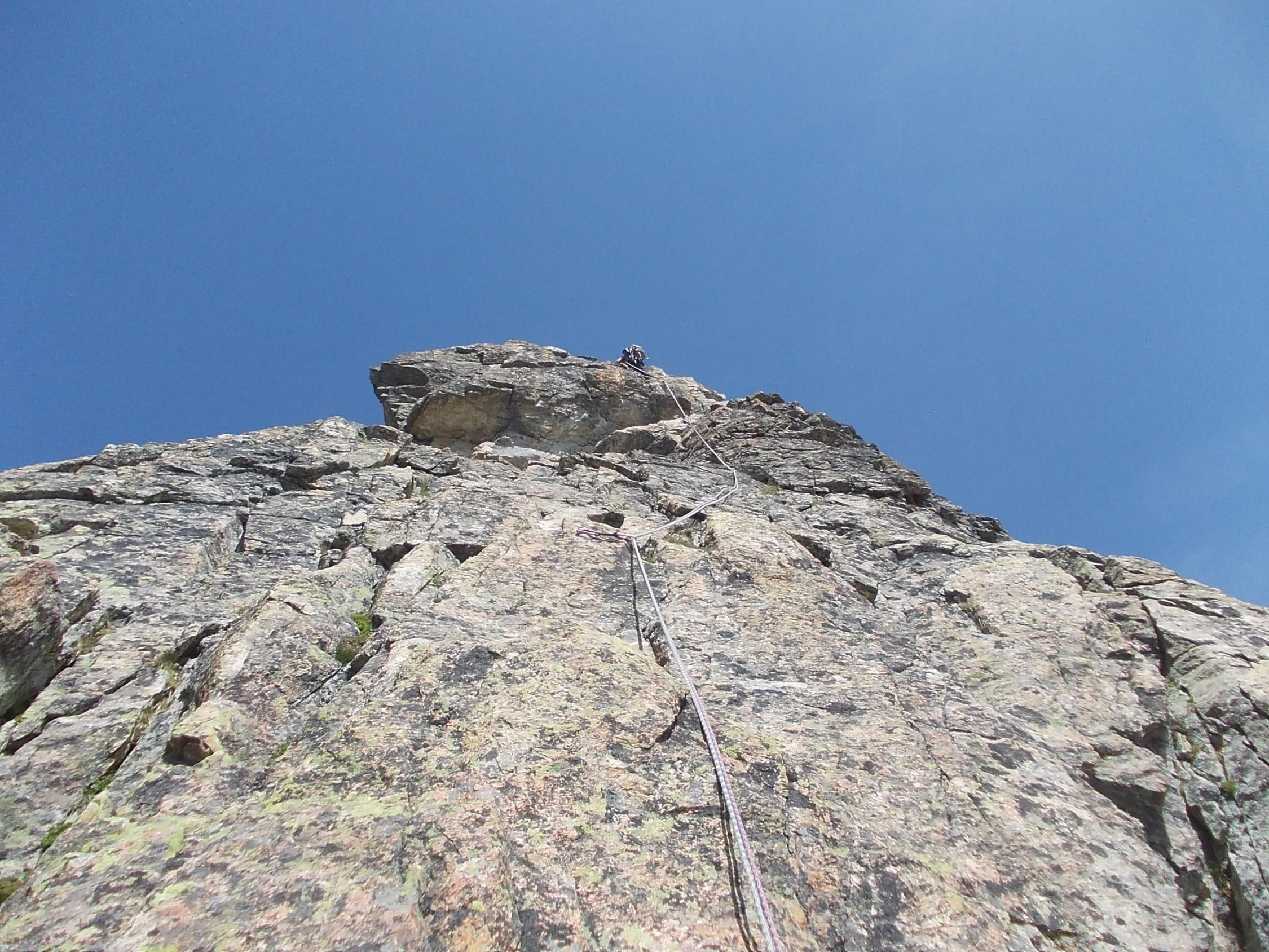 Spätnachmittags überraschend dichter Wolkenaufzug. Den Parkplatz erreichten wir aber gegen 19 Uhr trockenen Fußes. Wir waren heute allein an diesem ohnehin nicht sehr häufig begangenen Berg. Insgesamt ein sehr langes, alpines Unternehmen. Es dürften wohl um die 20 SL sein. Wir gingen die meiste Zeit gleichzeitig am Seil und benötigten für die reine Kletterei bis zum Gipfel dennoch 6 Stunden. Abgesehen vom Gipfelturm klettert man fast immer in bombenfestem Gneis, hat Spaß gemacht!