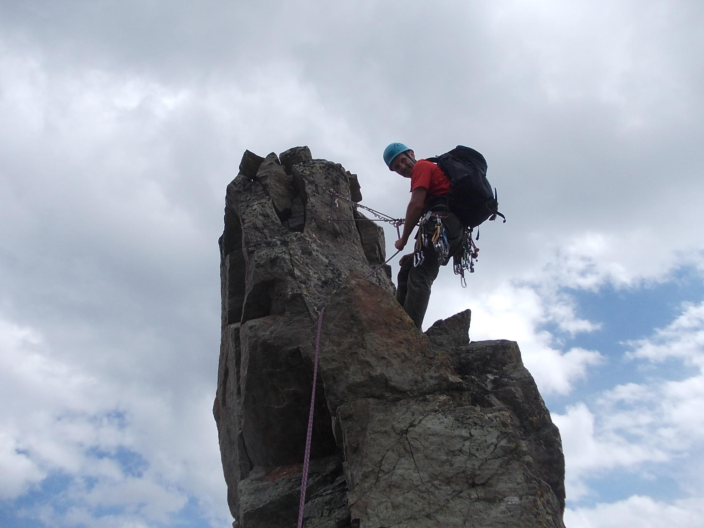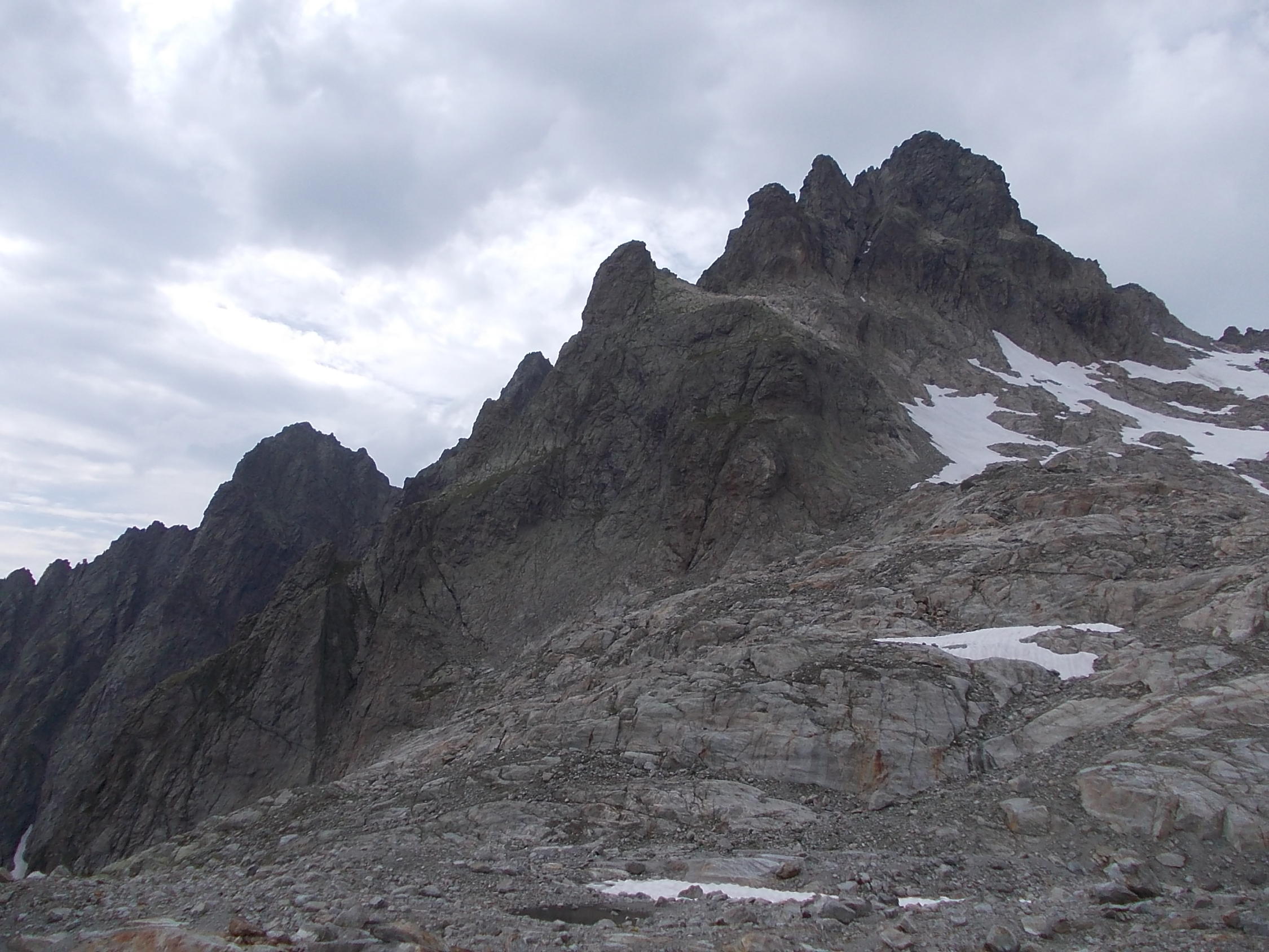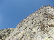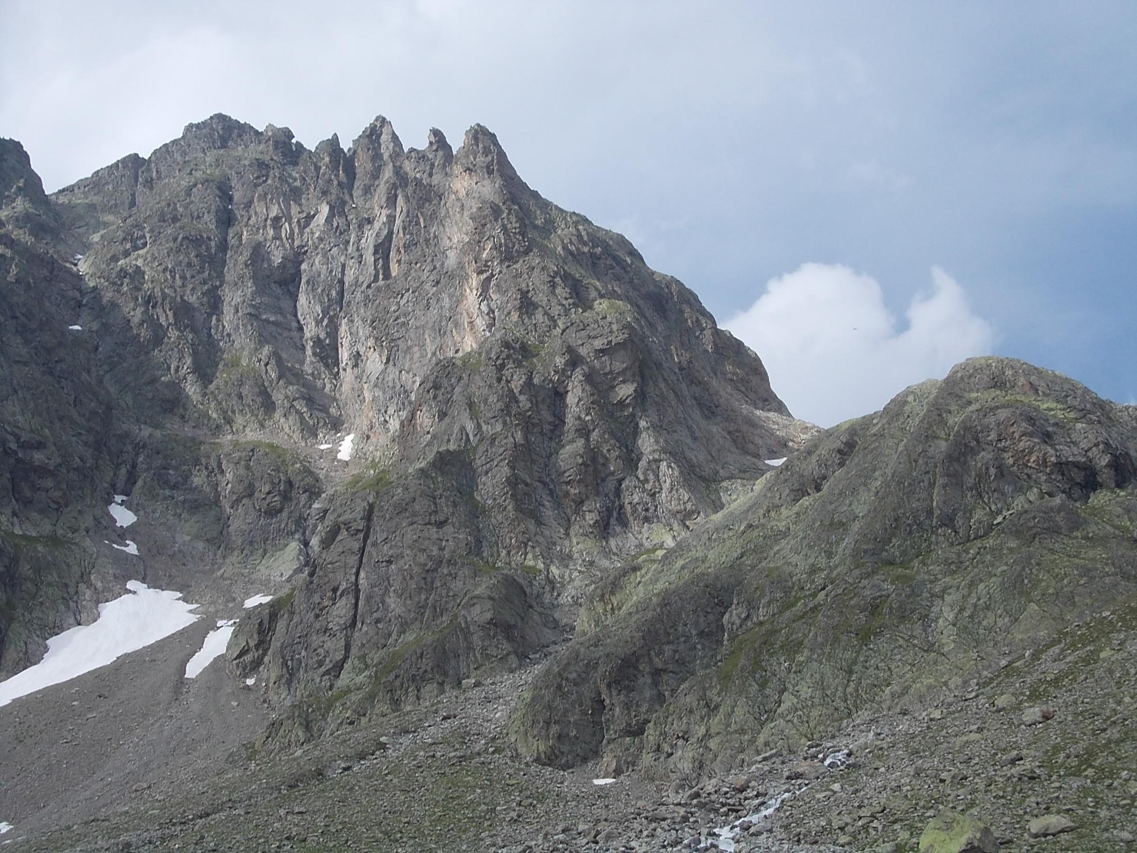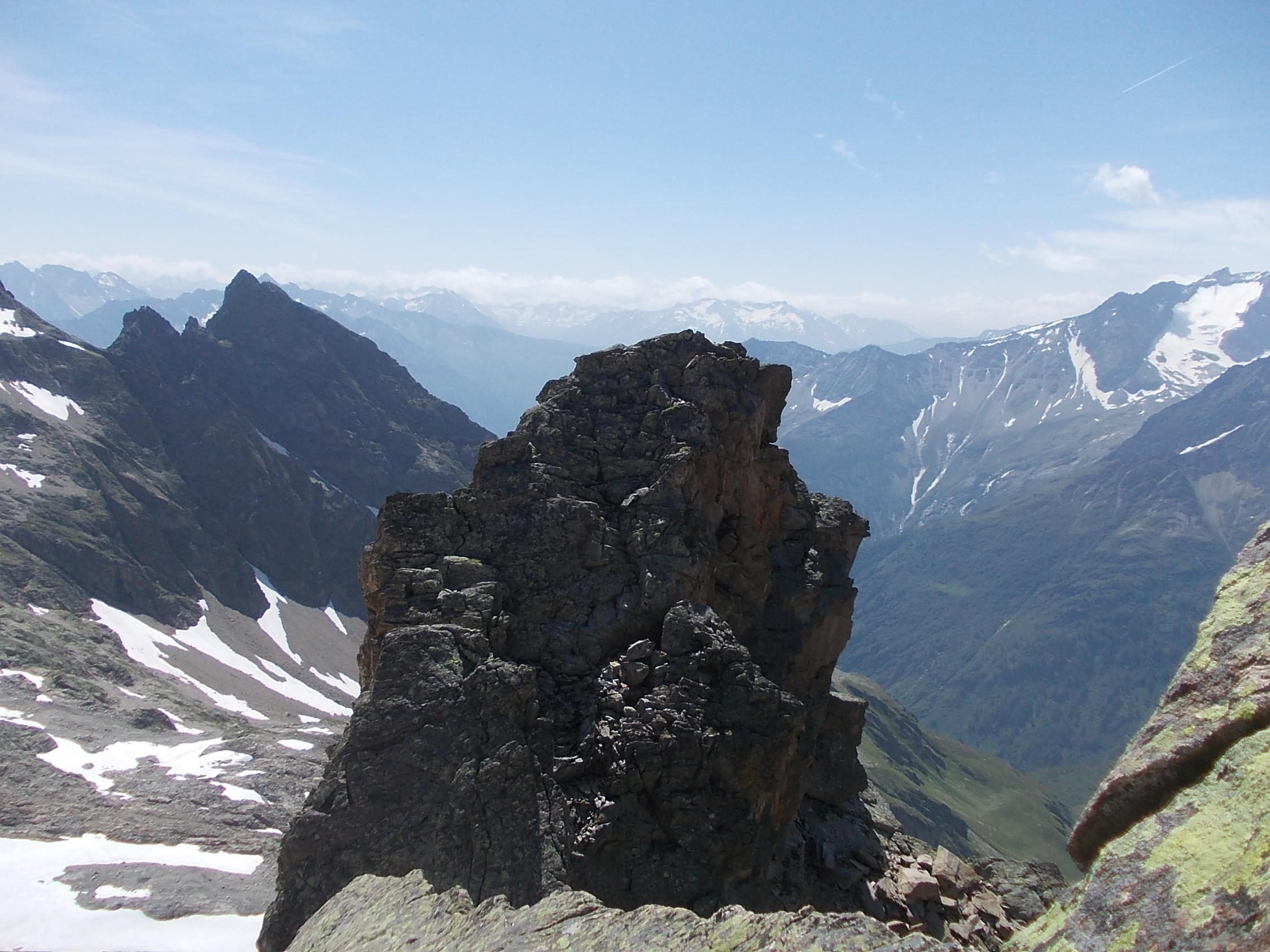 Spätnachmittags überraschend dichter Wolkenaufzug. Den Parkplatz erreichten wir aber gegen 19 Uhr trockenen Fußes. Wir waren heute allein an diesem ohnehin nicht sehr häufig begangenen Berg. Insgesamt ein sehr langes, alpines Unternehmen. Es dürften wohl um die 20 SL sein. Wir gingen die meiste Zeit gleichzeitig am Seil und benötigten für die reine Kletterei bis zum Gipfel dennoch 6 Stunden. Abgesehen vom Gipfelturm klettert man fast immer in bombenfestem Gneis, hat Spaß gemacht!