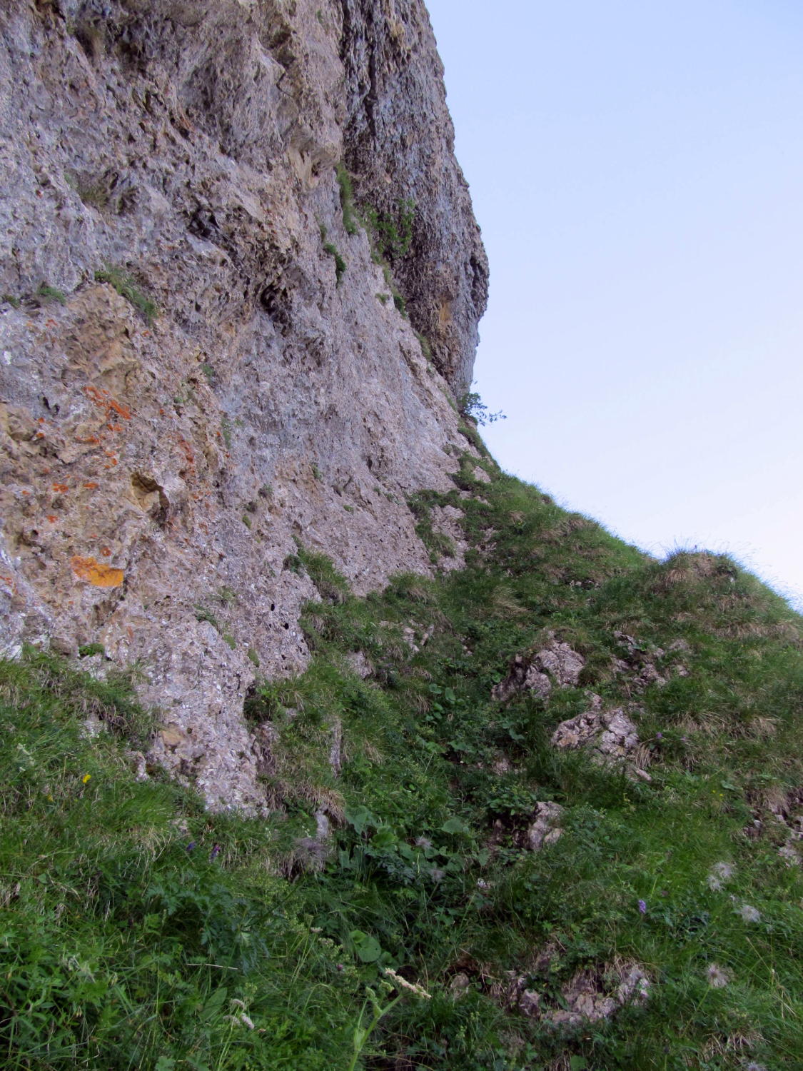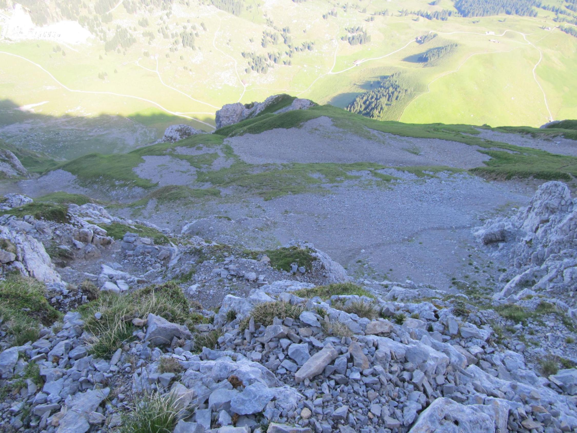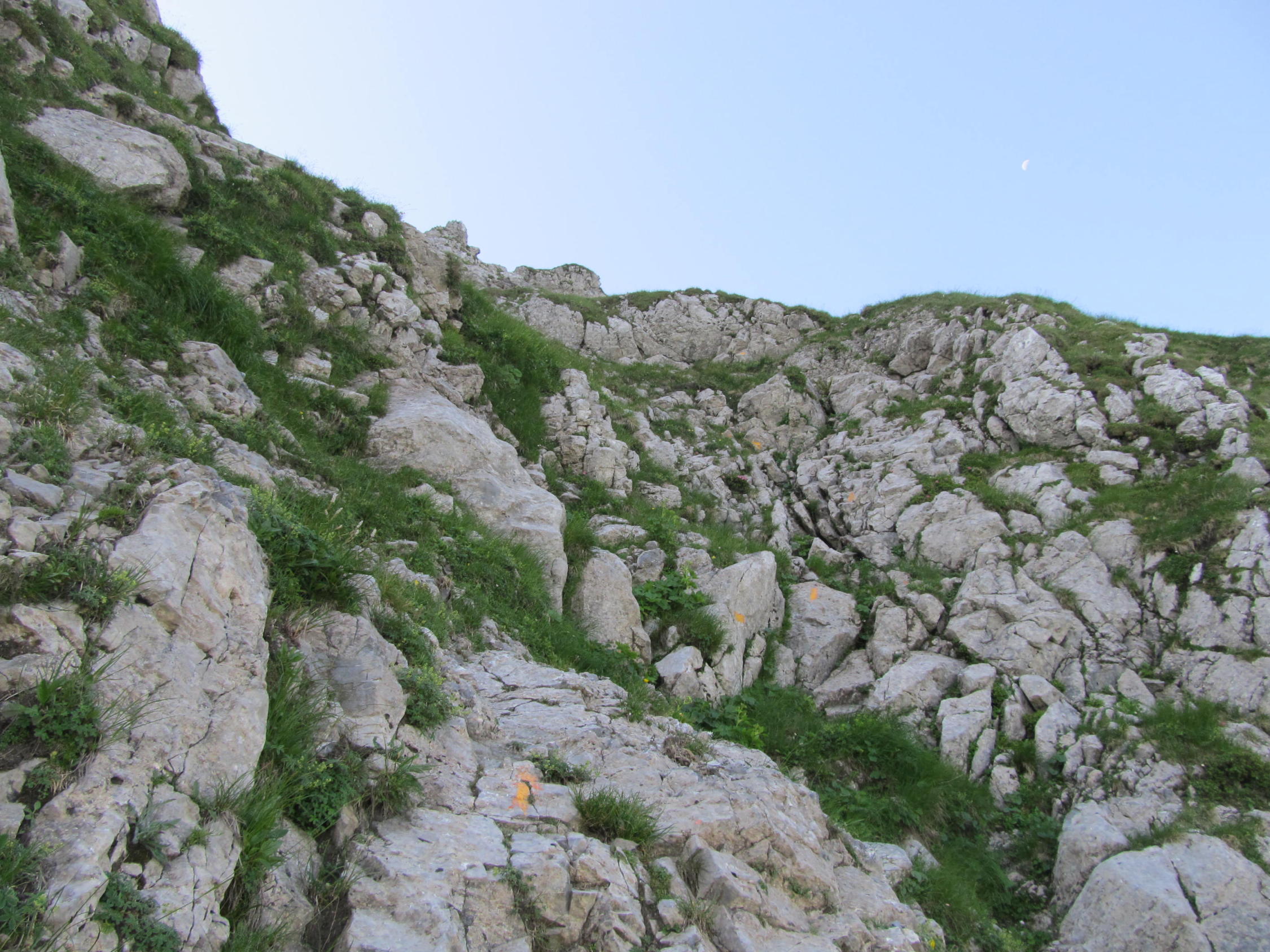 Wolkenlos, trocken und schon am Morgen recht warm mit 17 Grad. Trockene Verhältnisse erleichterten die erdige Querung im hohen Gras nach dem Einstieg. Am Beginn der Schrofenzone können Stöcke verstaut werden, da im steilen Aufstiegsgelände fast ständiger Bodenkontakt mit den Händen besteht.