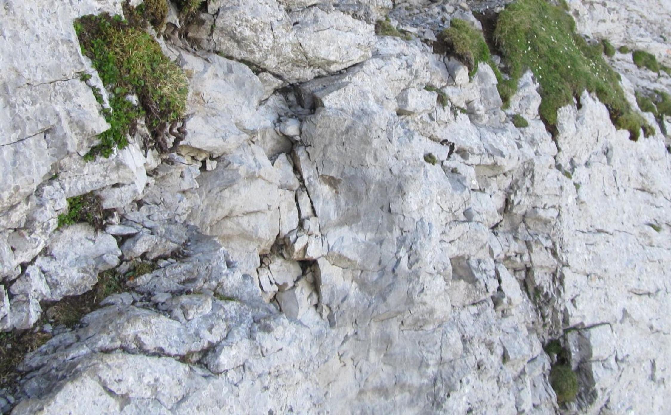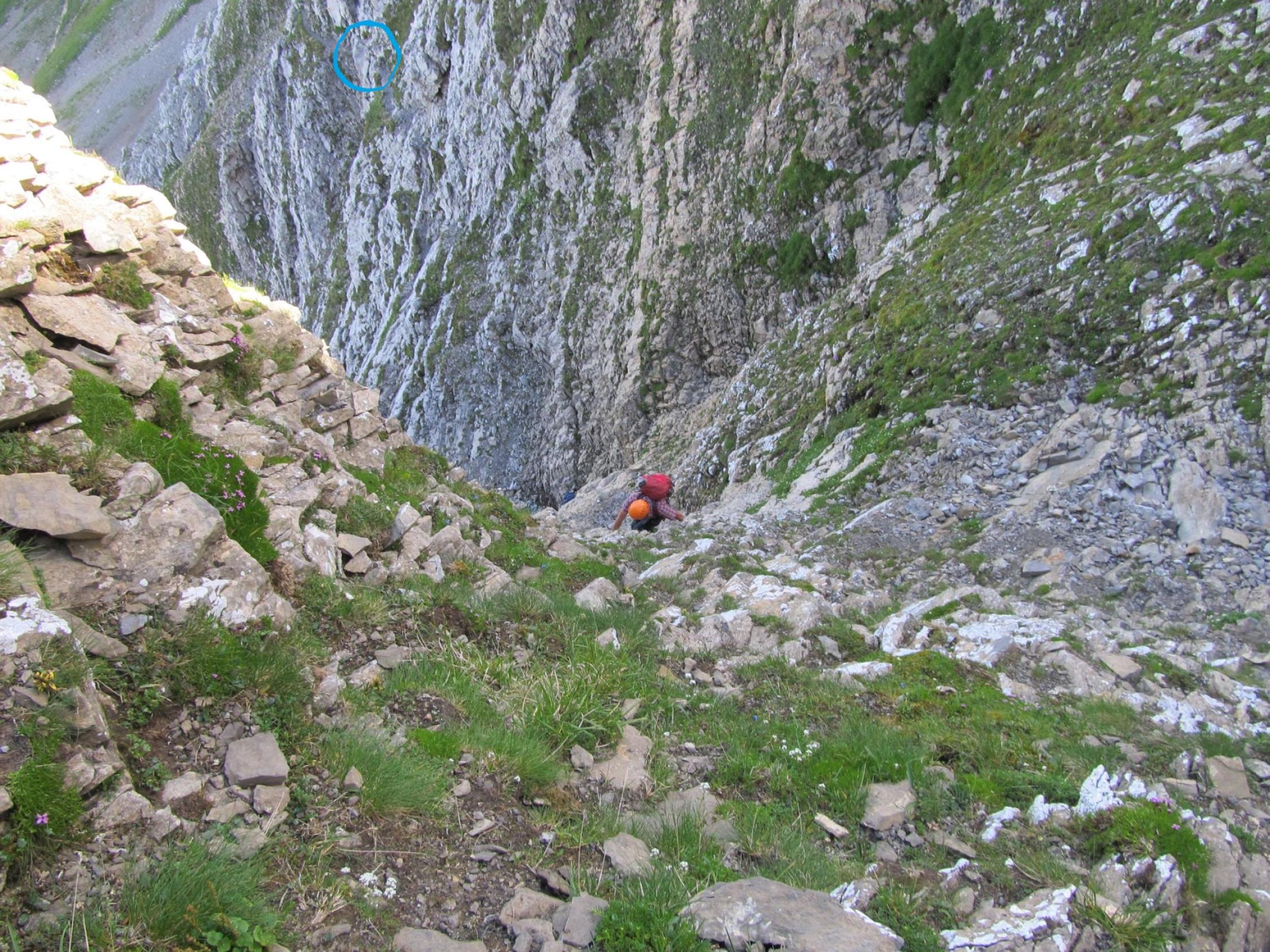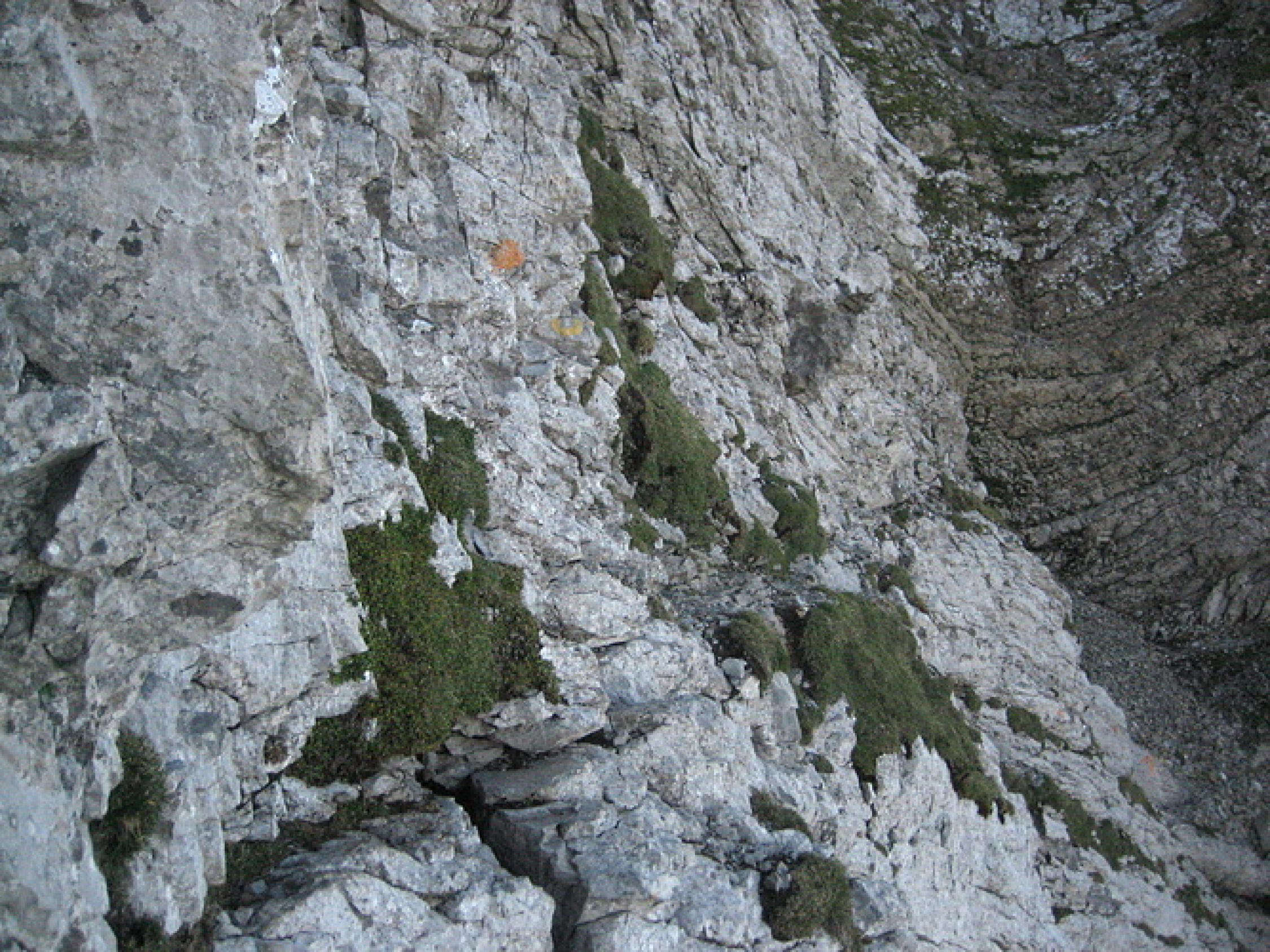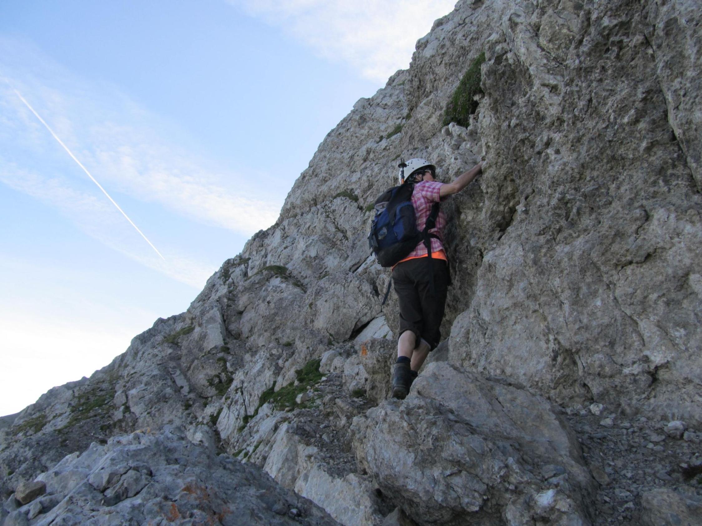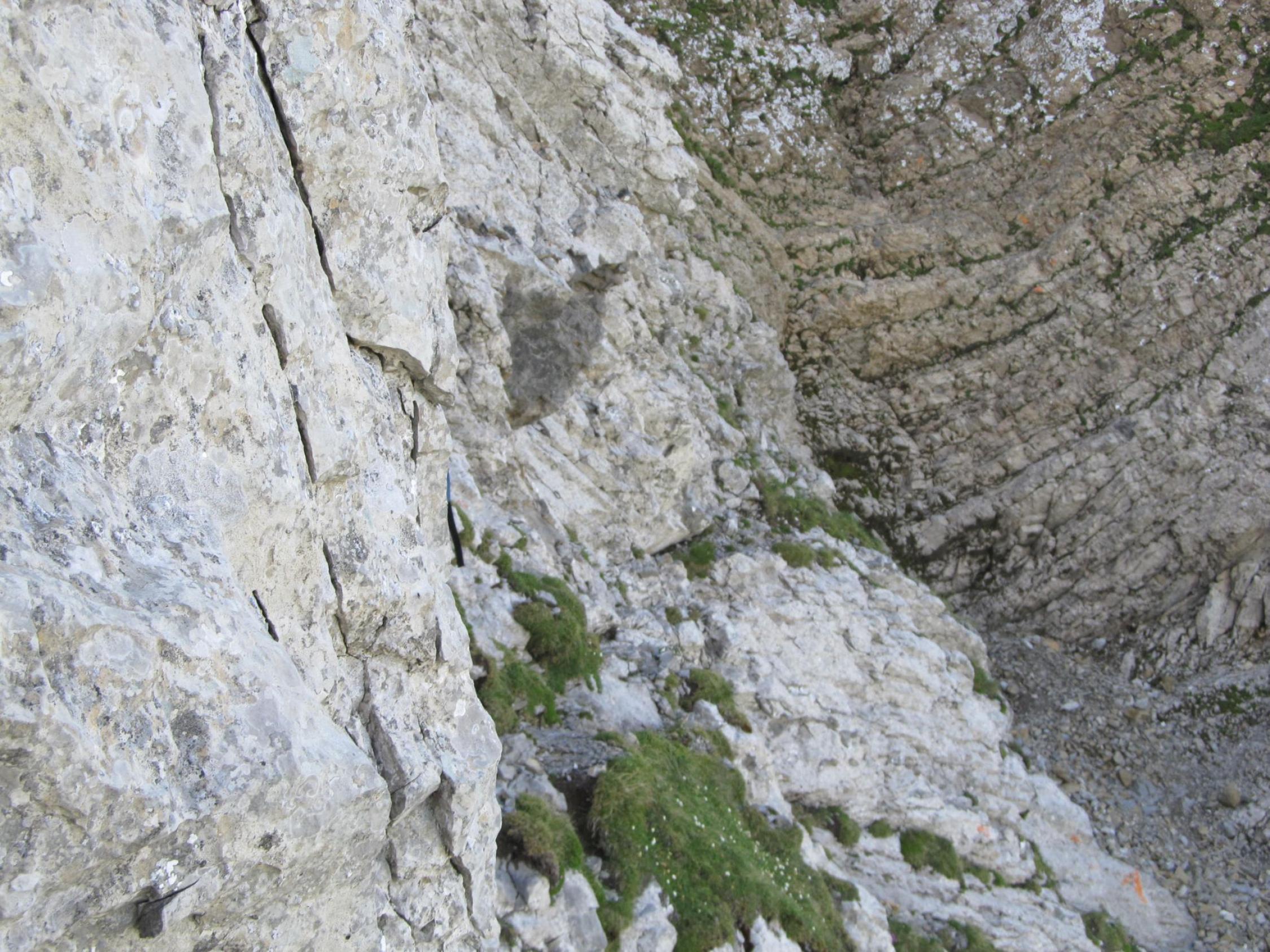 Dort konnten wir auch sehen, dass zu Beginn der Passage seit unserer letzten Begehung 2011 ein Stück Fels herausgebrochen ist. Es ist nun ein Spreizschritt erforderlich, bei dem man darauf achten sollte, dass neben dem Standbein vorne auch der nachgezogene Fuß noch Platz findet. Durch diesen Felsausbruch ist dieser Abschnitt zu einer echten "Schlüsselpassage" geworden. Ab dem "Großen Band" und im Ausstieg aus dem Trichter muss man auf Steinschlag achten (Helm)