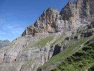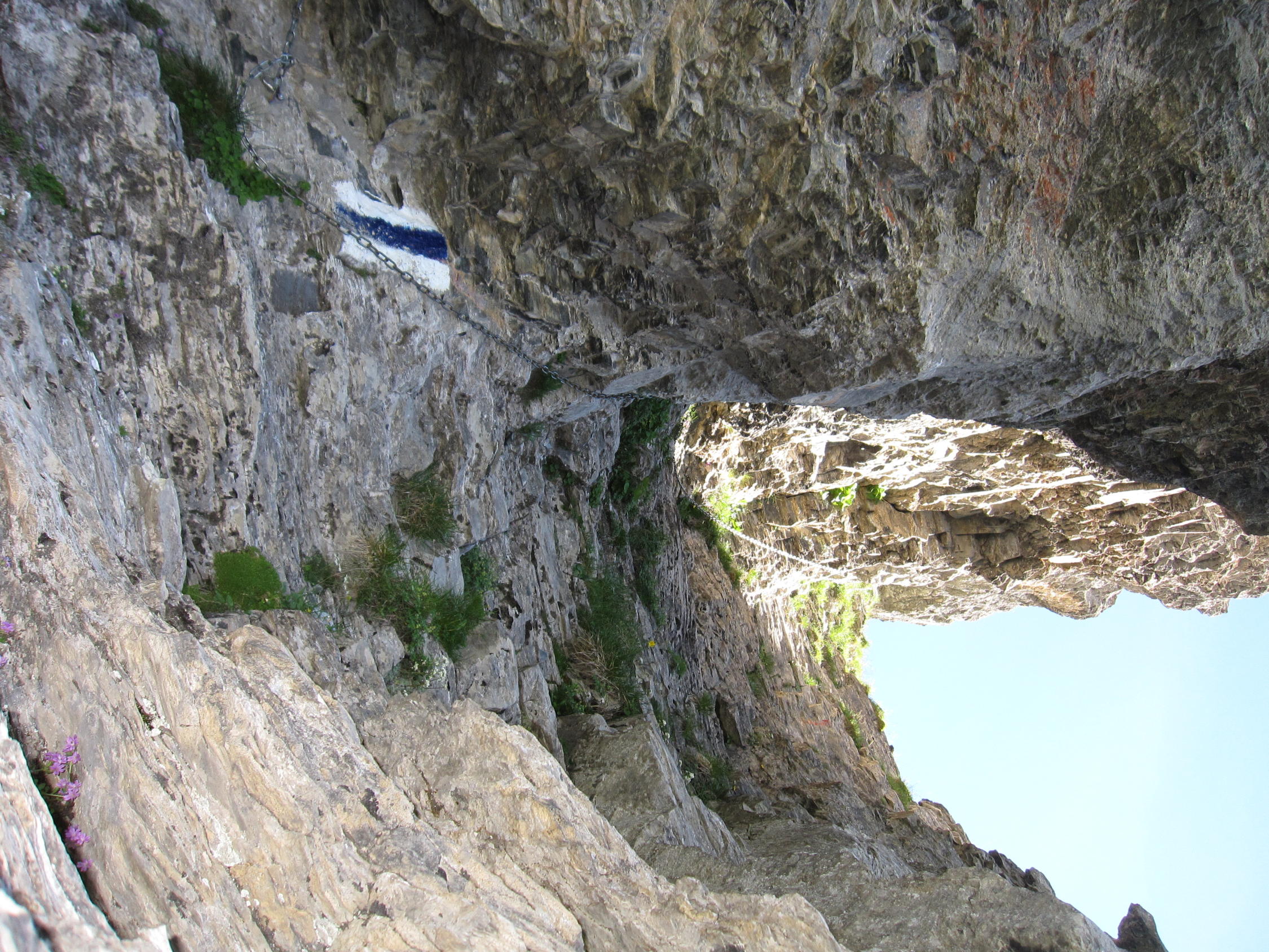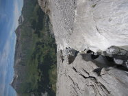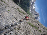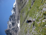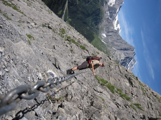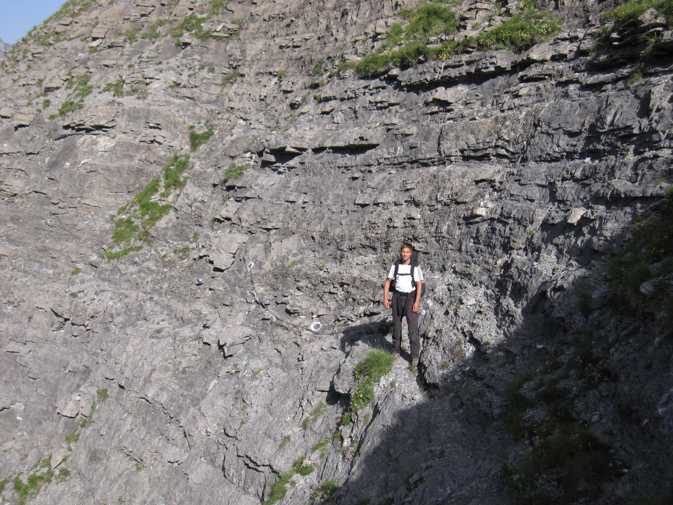 Bei Nässe nicht zu empfehlen, Traverse in ausgesetzter Wand verzeiht keinen Ausrutscher, Felsplatten bei Nässe ebenfalls heikel