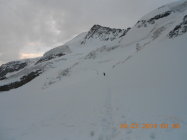Direkter Aufstieg zur Fuorcla Prievlusa momentan objektiv sicher, gute Spur.An dem Tag hat keiner den "Klettersteig" benutzt.Noch viel Schnee im unteren Felsteil.Die schwierigen Stellen sind aber trocken.Der Schneegrat selber hat guten Firn, gute Spur.Im oberen Drittel konnte man an einer Stelle schon das Blankeis erahnen, etwa 5-6 m.
