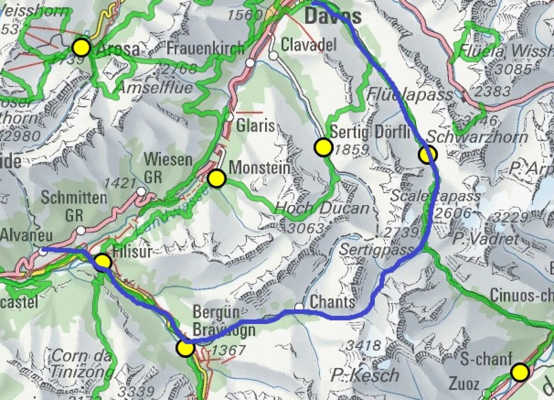Davos - Scalettapass - Alp Funtauna - Keschhütte Von Davos durchs Dischmatal zum Scalettapass 2606m, von dort auf einem tollen Trail zur Alp Funtauna 2192m und den Bike/Wanderweg (Nr. 339) zur Keschhütte 2632m gefolgt. Weiter nach Bergün, Filisur und Alvaneu Dorf.