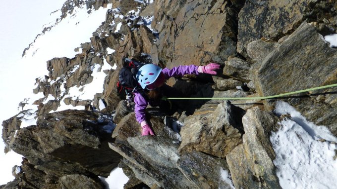 Im Grat hatte es noch Schnee. Wir kletterten ohne Steigeisen bis zum Vorgipfelschneefeld. Ab hier mit Steigeisen den Durchgehenden Grat, die kurze Felsstufe ist im Moment voll zugeschneit, bis zum Hauptgipfel in guter Spur.