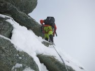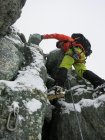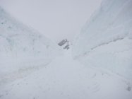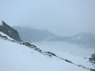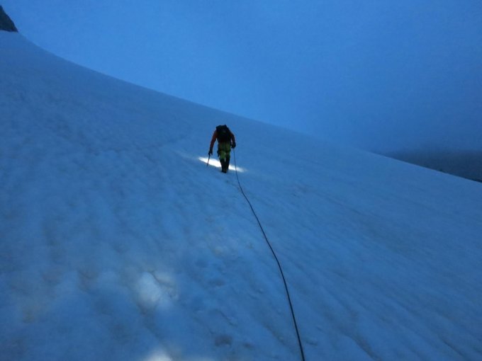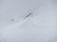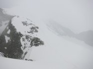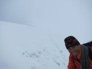 Start um 4:35 bei Nebelnieseln und später einsetzendem Regenschauer. Oberhalb ca. 3‘200 Meter leichter Schneefall, der uns praktisch bis zum Gipfel begleitet hat. Spur gut ersichtlich, aber Schnee neben der Spur schlecht tragend… Felsstufe vor dem Gipfel hatte Schneeauflage.