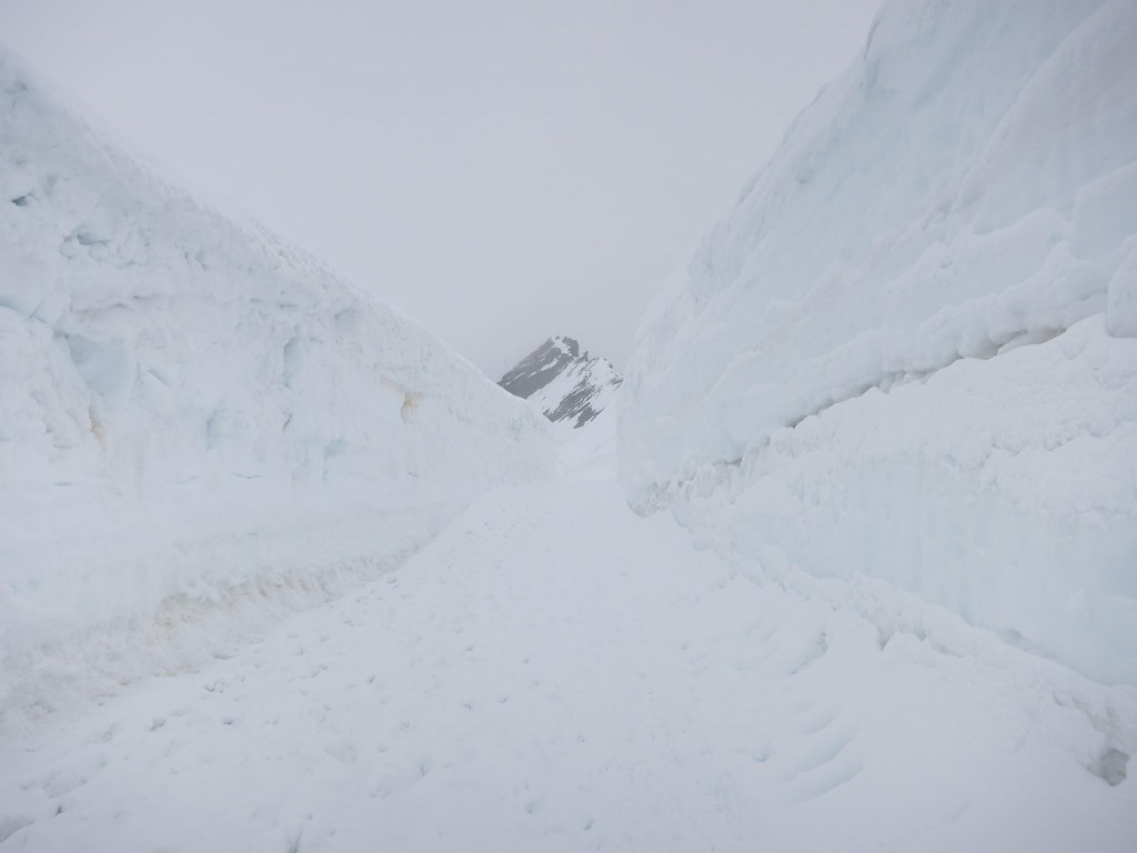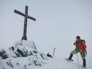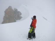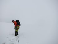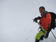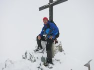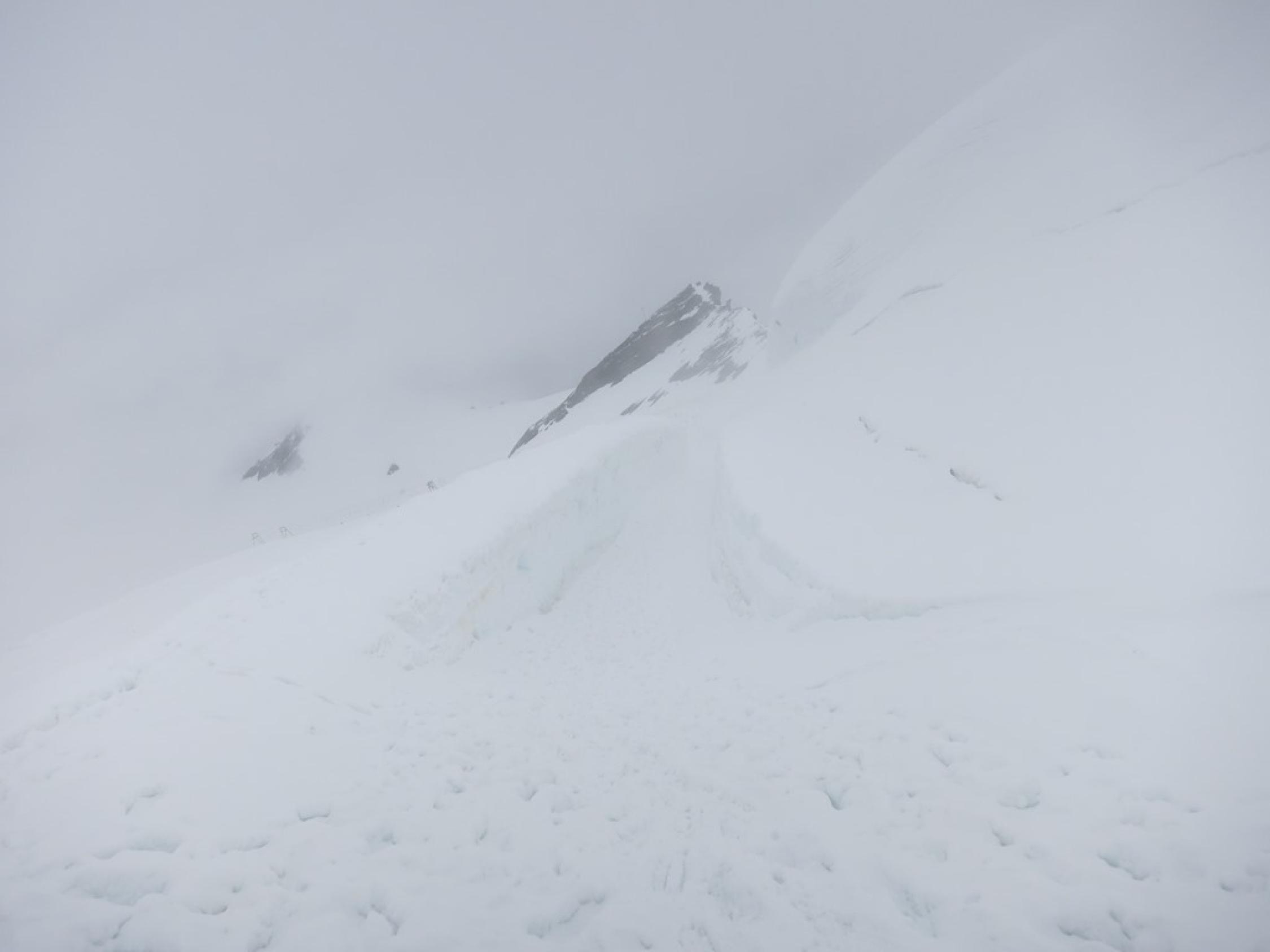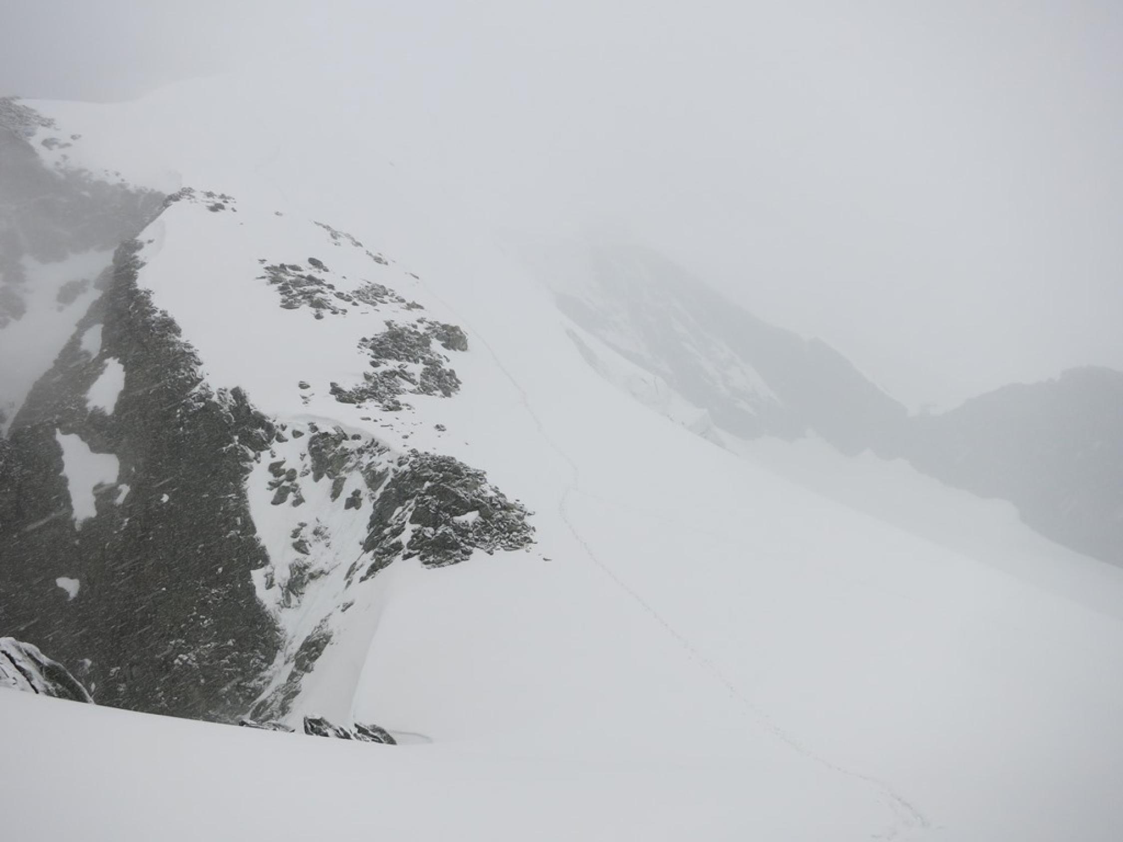 Am Gipfel waren die Spuren vom Normalweg komplett mit Neuschnee zugeweht. Mit dem zusätzlich dichten Nebel hatten wir praktisch ein Whiteout. Jetzt wieder gespurt….