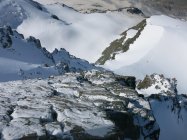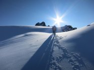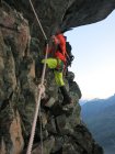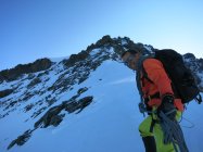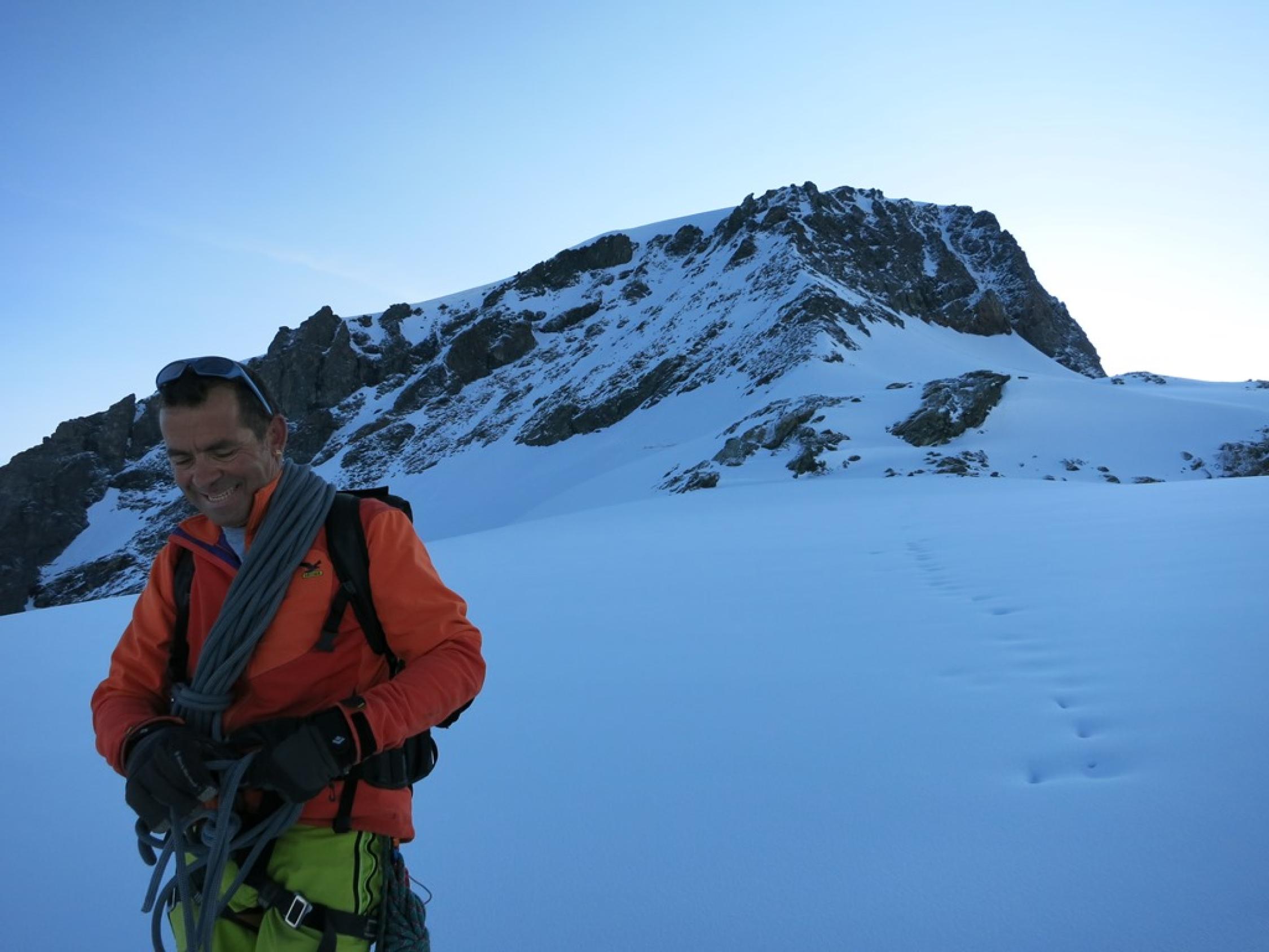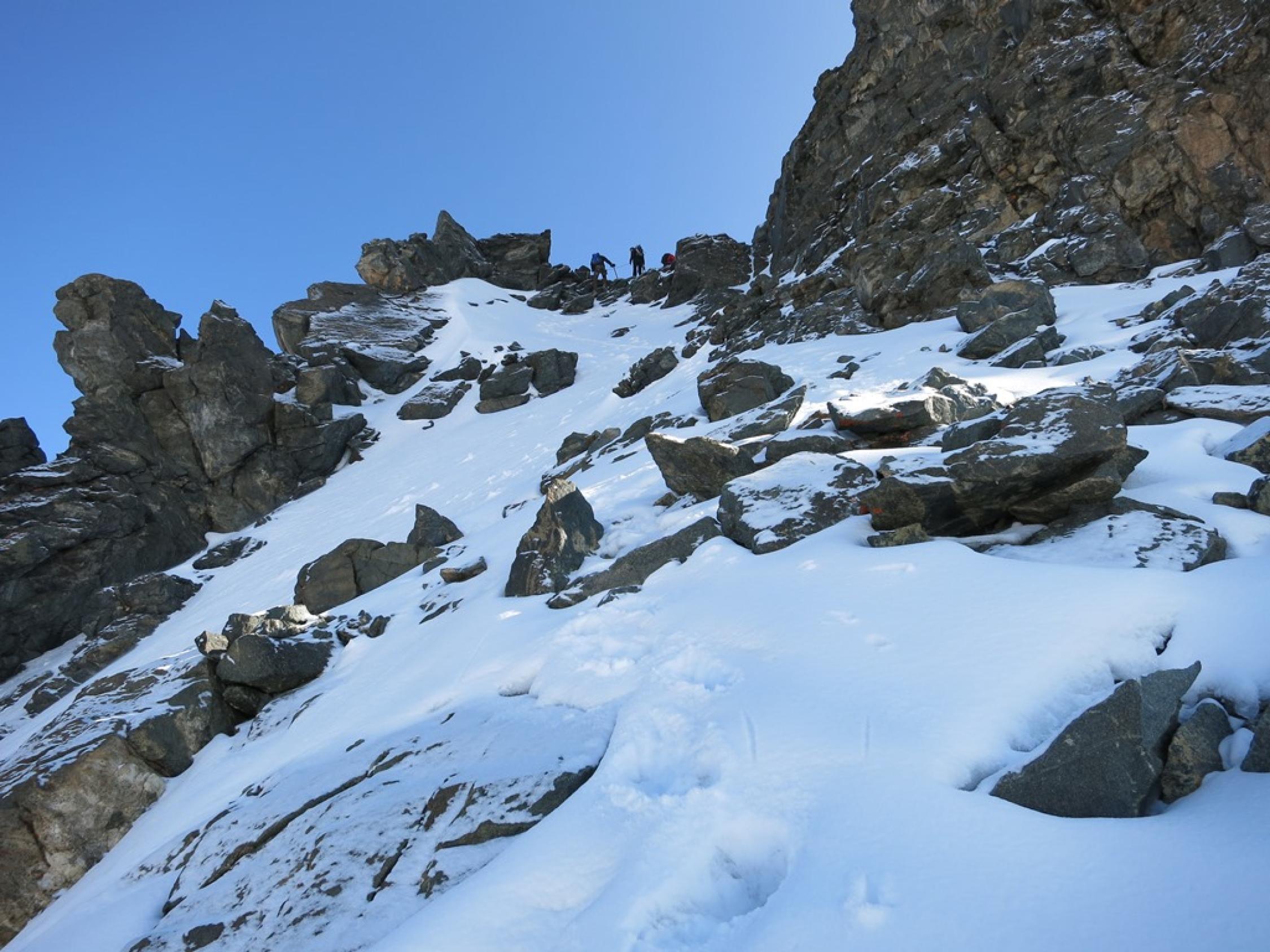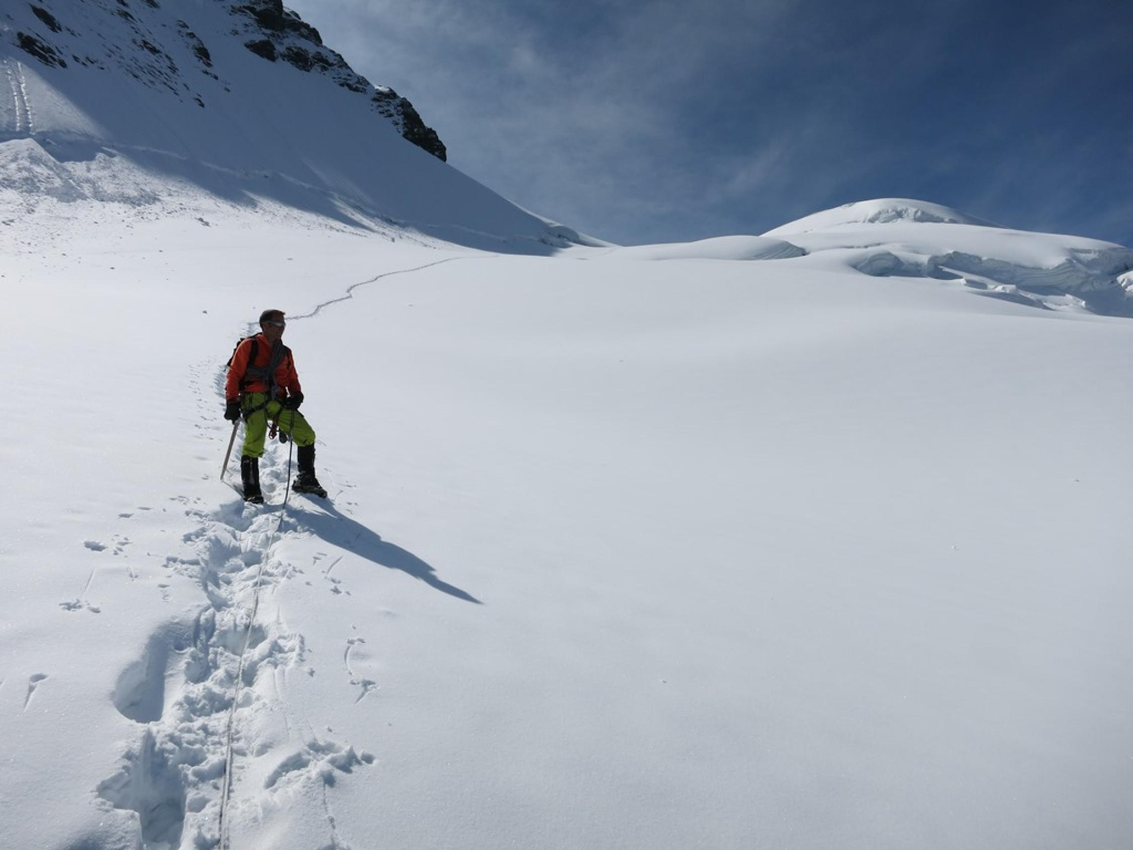 Strenge Verhältnisse auf der ganzen Tour: Schneedecke auf dem Längfluegletscher schlecht tragend, was zu einem sehr häufigen Einbrechen führte… Aufstieg Couloir am Gipfelaufbau musste neu gespurt werden.