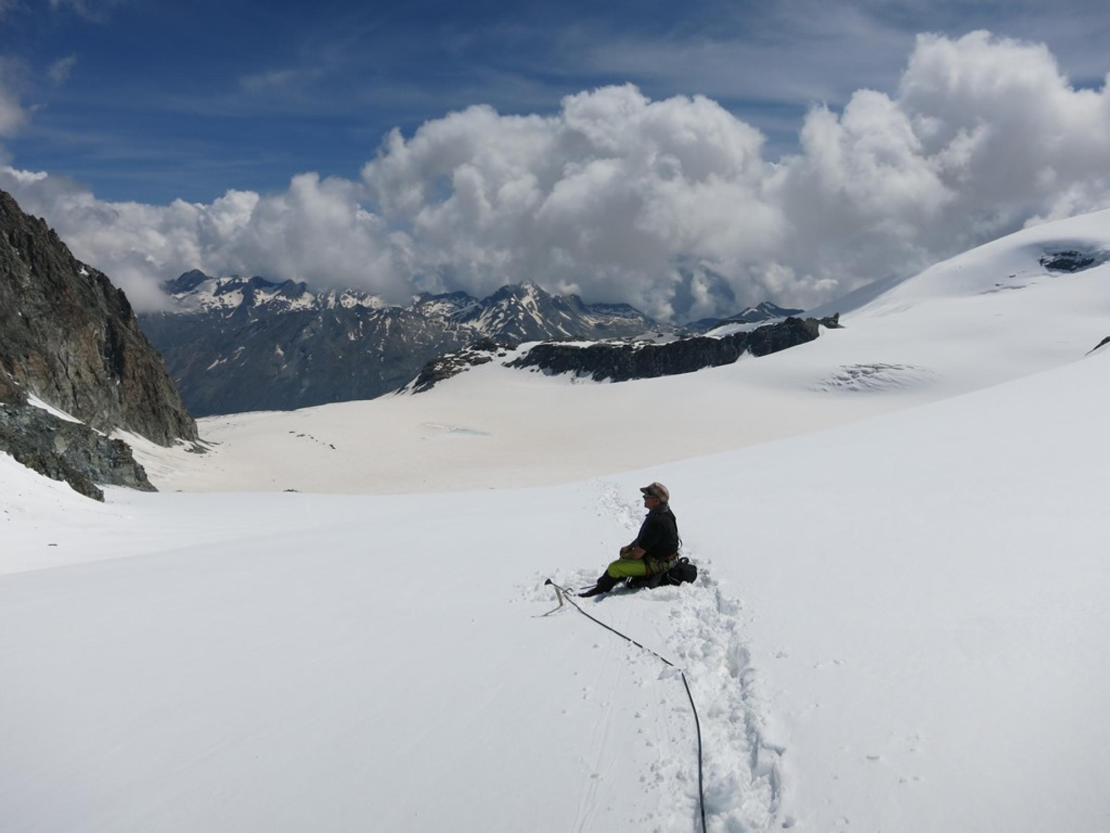 Im Abstieg vom Rimpfischsattel zum Allalinpass oft knietief eingesunken. Viel Neuschnee und warme Temperaturen machten uns fast mürbe…