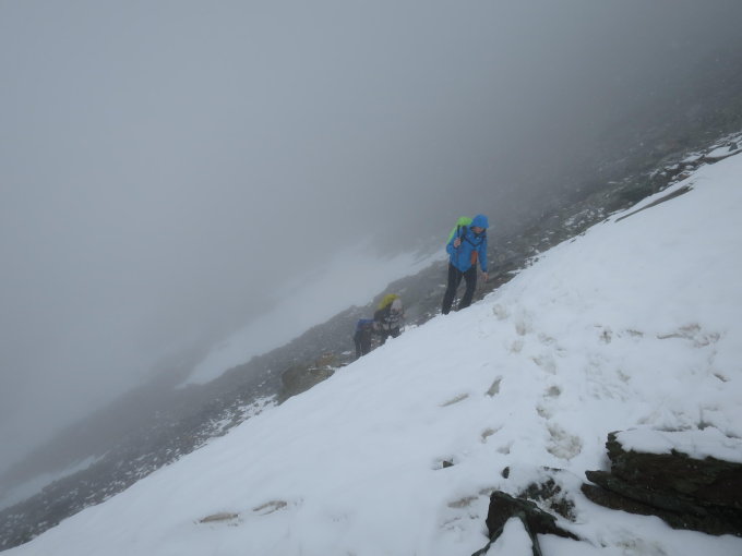 Ca.15cm Neuschnee, teilweise als Triebschnee verfrachtet durch starke Winde in der Nacht von Sa auf So. Bedingungen insgesamt sehr gut, Gletscher sehr gut eingeschneit und eine klare Spur über den Gletscher bis auf den Gipfel vorhanden.
