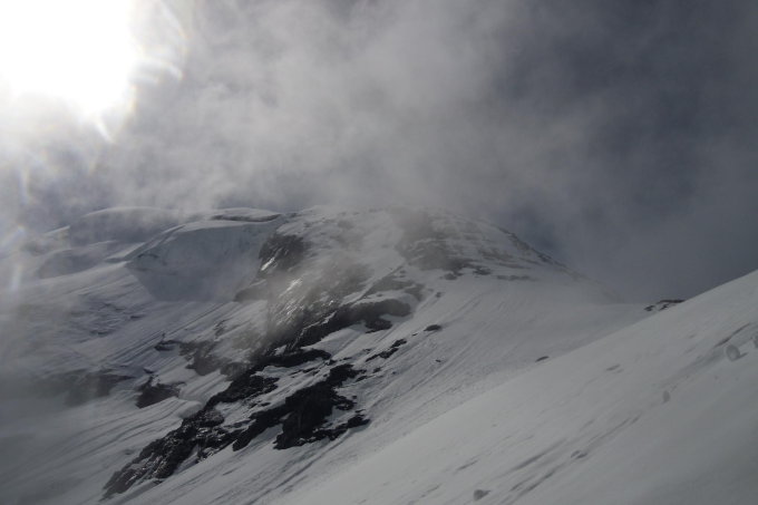 Wollten die Nordwand hoch. Dafür viel zu warm, zu viel Neuschnee und kein Durchfrieren wg. bewölkter Nacht (Vorhersage am Freitag: klare Nacht!!) Viel Schnee in der Wand (unten tief und feucht, oben wohl pulvrig (?!)). Blankeis von vor 2-3 Wochen im oberen Teil (rechts neben Serac) komplett mit Neuschnee bedeckt - wenn es einmal durchfrieren sollte, könnte es stabilen Trittfirn geben.