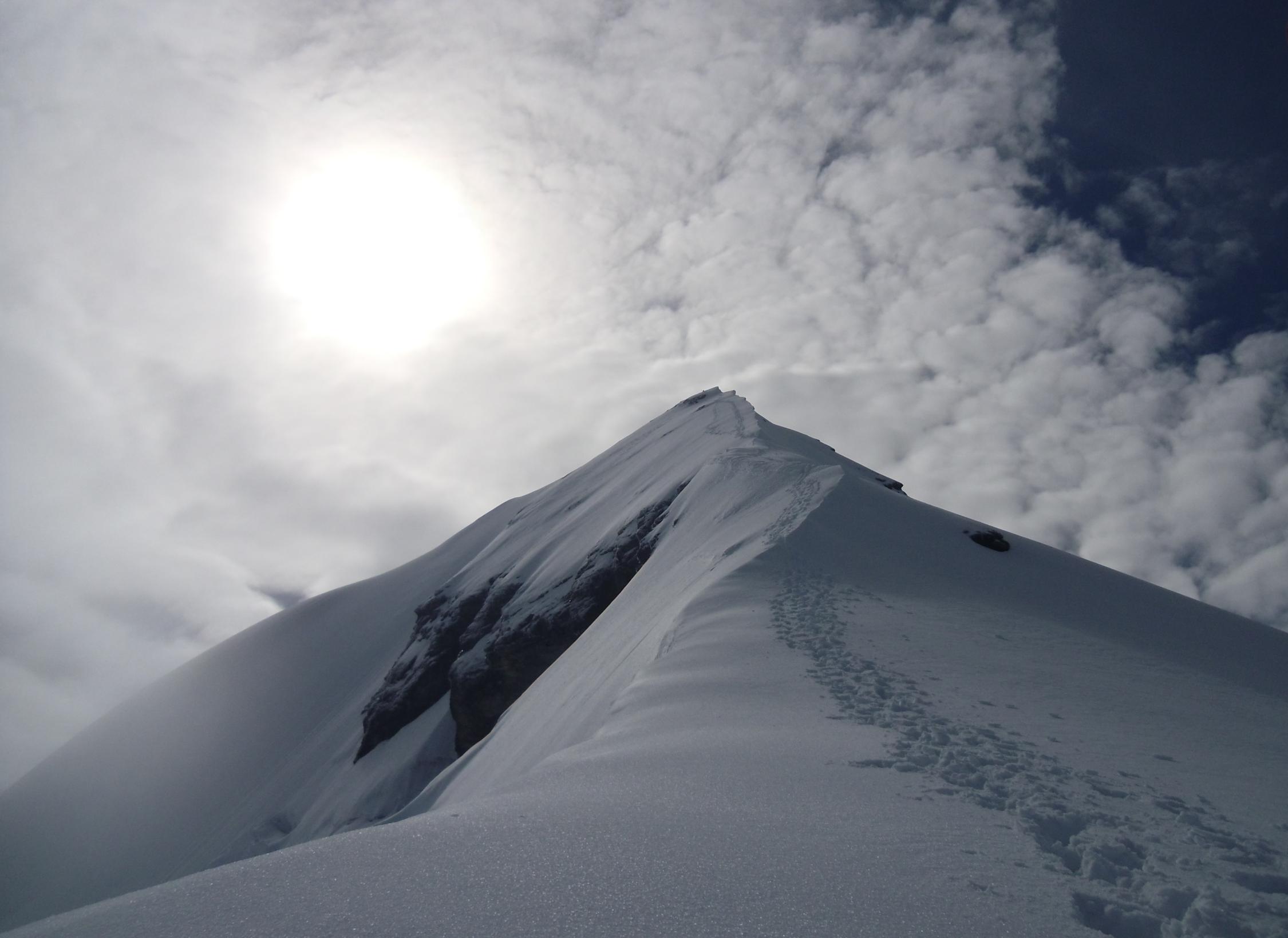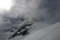 Samstags und in der Nacht auf So Regen und tiefe Wolken - kein Durchfrieren. Schnee bereits morgens sehr tief und gatschig. Oberhalb 3100 mehr und mehr Neuschnee. Die Platten am NW-Grat können derzeit noch komplett im Schnee gegangen werden - dann allerdings quasi keine Sicherungsmöglichkeit, weil Schneerinne abseits der Sicherungsstangen (wir sind alles seilfrei gegangen). 2 Eisgeräte sehr angenehm. Schnee tief und recht feucht, aber stabil. An den Stangen feuchtes, abplatzendes Wassereis darunter - unangenehm - alle Seilschaften sind umgedreht. Daher ab Mitte der Platten harte Spurarbeit für uns ;) Oberhalb der Platten viel Neuschnee am Grat (tw. knietief). Leichte Windverfrachtungen.