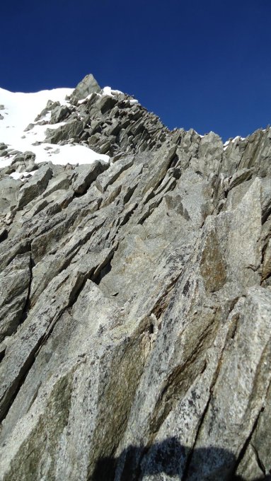 Gletscher fast aper. Schneehang vor dem Einstieg morgens um 6 schon weich, Fels trocken.