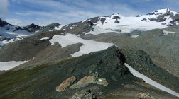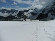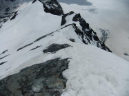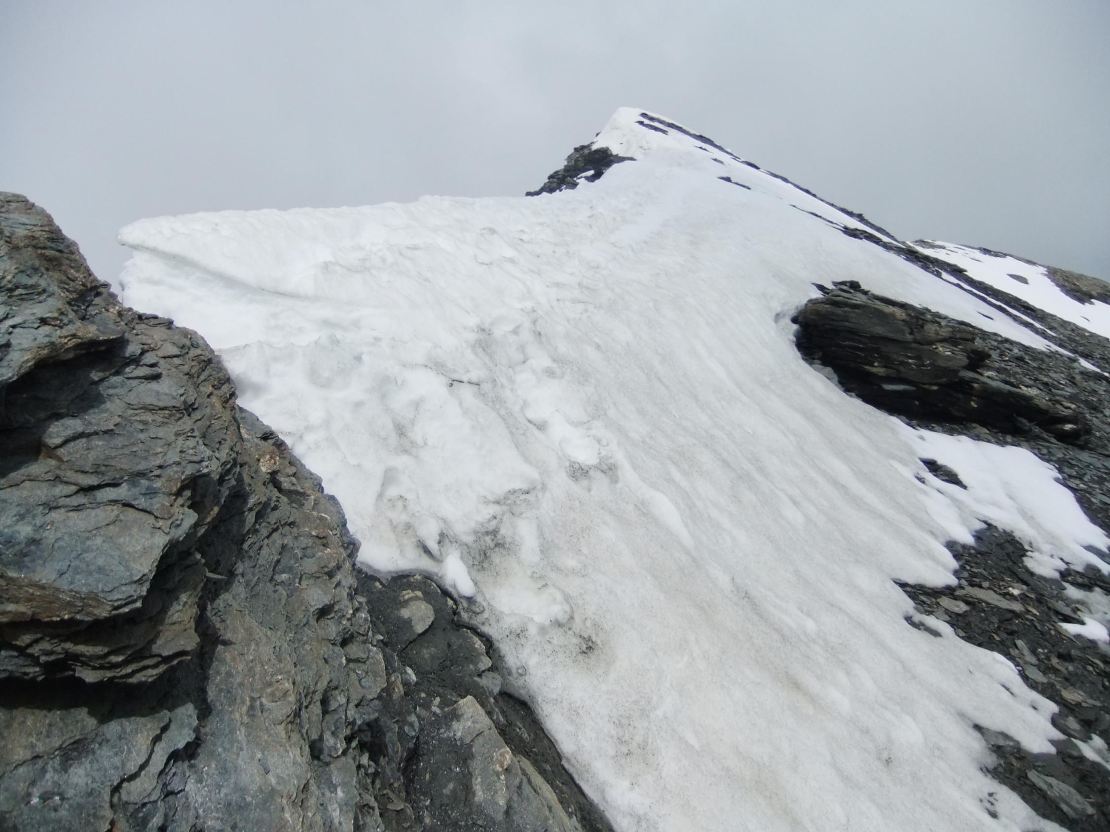 Im unteren Bereich ist der Gletscher aper. Doch ab der Senke nach 200 m liegt noch bis zu 30 cm Schnee auf diesem. Der Gipfelgrat ist nur an wenigen Felsstellen schneefrei. Ausreichende Fußspuren sind vorhanden.