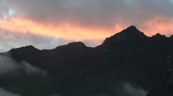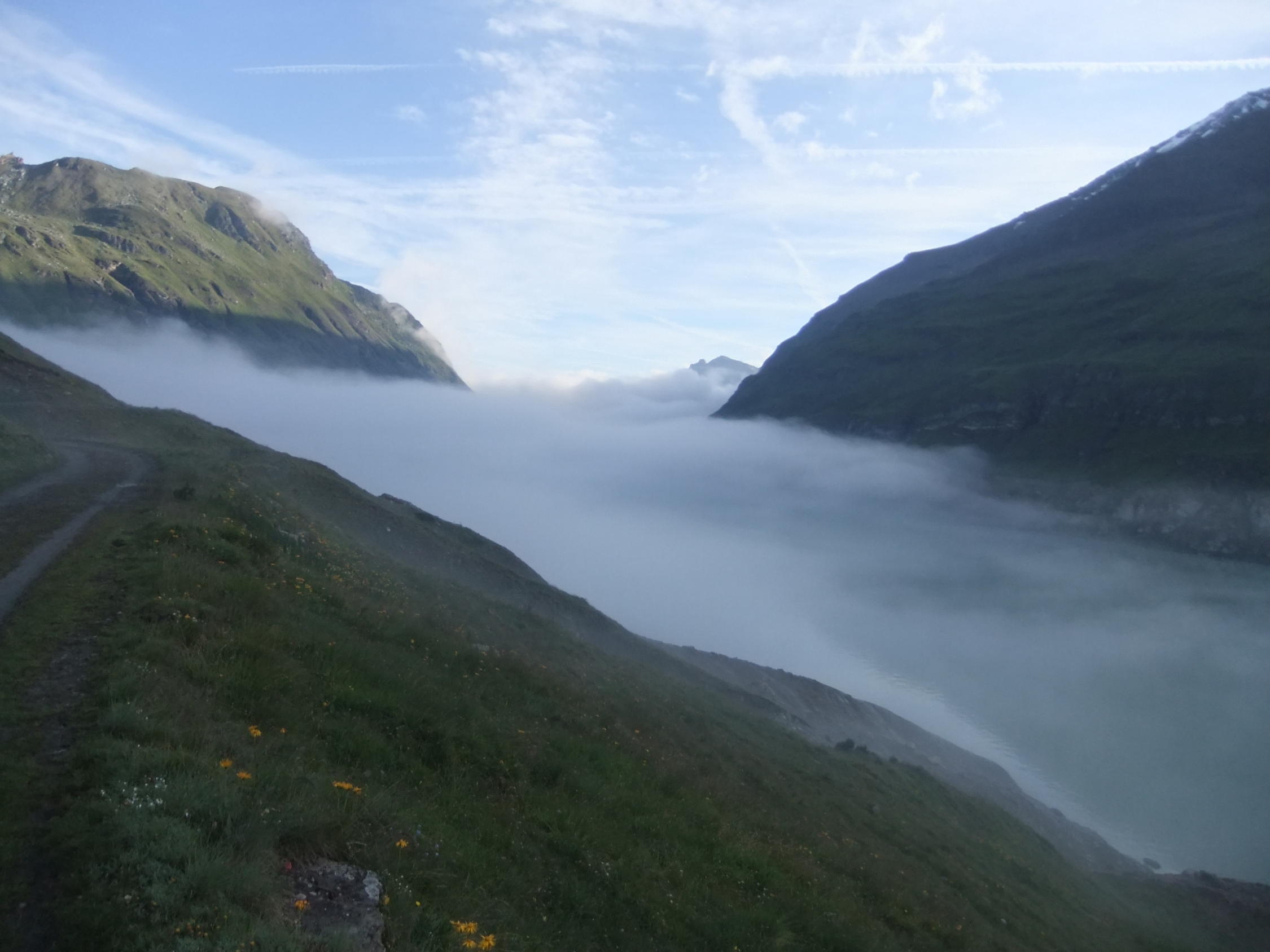 Tourenbeginn um 06:30 Uhr bei Morgenröte über dem Pte. de Vouasson und Wanderung entlang des Stausees in ständigem Wechselspiel von Nebel über dem Stausee und aufgegangener Sonne darüber.