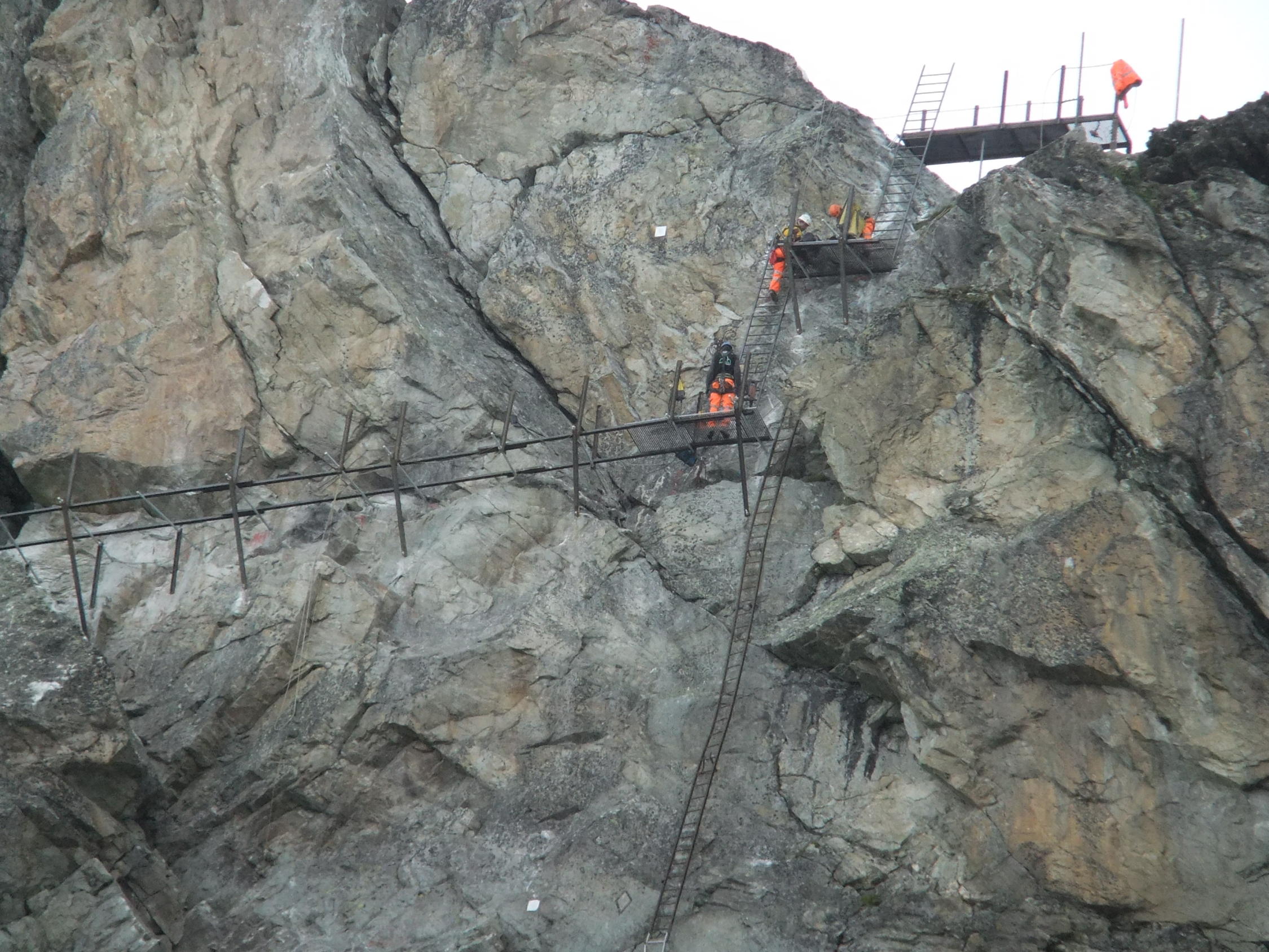Der Ziegenpass (Pas de Chevres) ist wegen Baumaßnahmen oberhalb senkrechter Leiter wohl noch längere Zeit gesperrt. Werden dort Steinfangnetze installiert, oder eher neue eiserne Treppen ? Wer hat Infos darüber ? Von / nach Arolla gelangt man z.Zt. nur über den höheren Col de Riedmatten 200 m nördlich vom Ziegenpass.