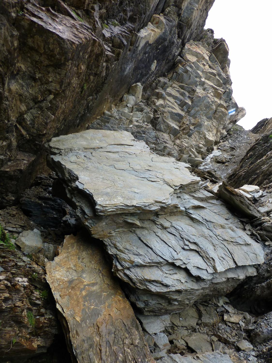 Kürzlich muss sich ein riesiger Steinblock aus der Westflanke gelöst haben (siehe Bild), der nun die Aufstiegroute zwischen den Chräjenchöpf und der Beverin-Lücke blockiert. Man kann aber gut bergseitig zwischen Block und Felswand durchschlüpfen, so dass man den Weg problemlos fortsetzen kann.