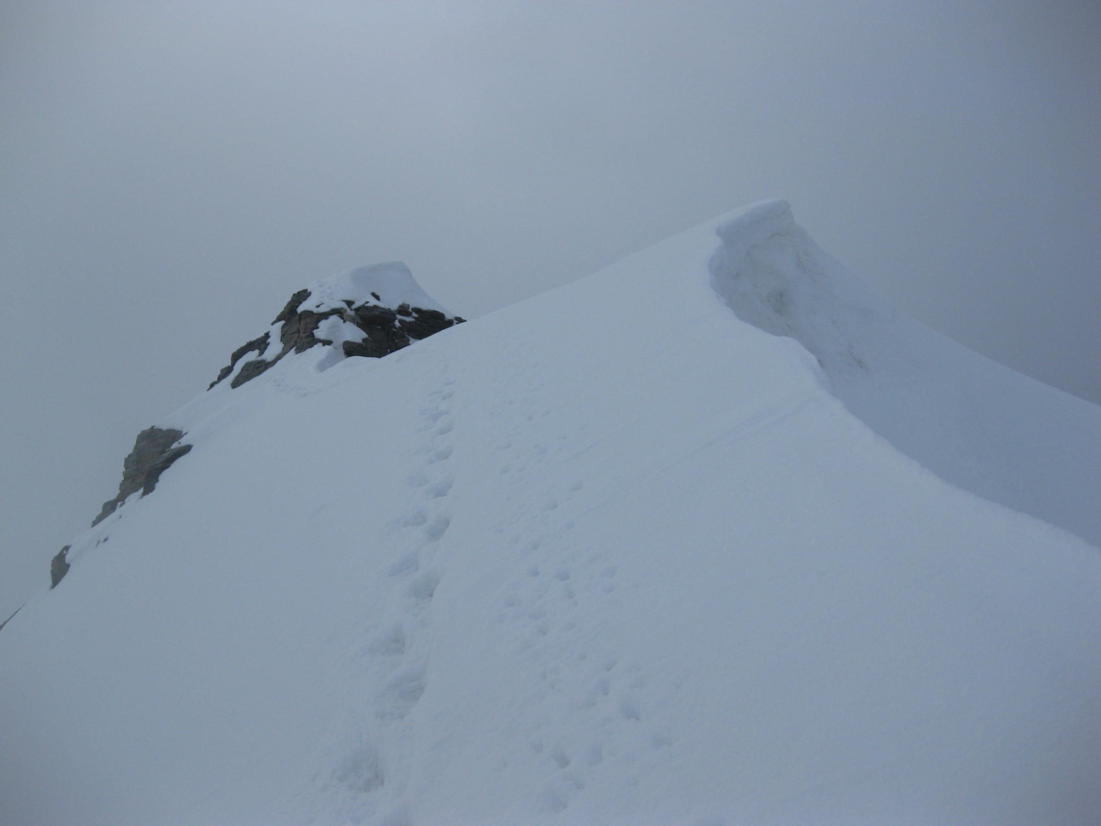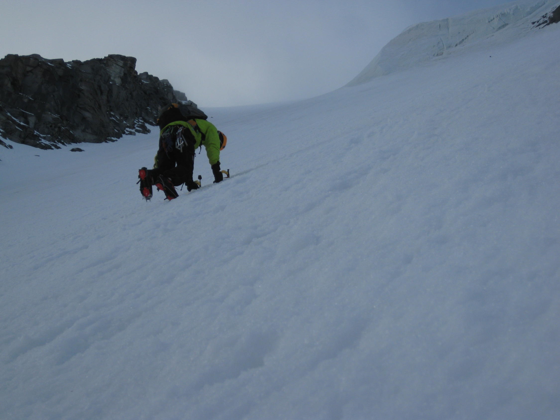 Die Schneemengen und momentan milden Temperaturen machen nach der Abzweigung vom Normalweg in Richtung Bergschrund eine etwas mühsame Spurarbeit notwendig. Der Schrund selbst kann gegenwärtig an mehreren Stellen überschritten werden. Wir wählten eine Stelle etwa in Falllinie des Gipfeleiswulstes. Im oberen und unteren Wanddrittel zumeist guter Trittfirn (ca. 10 - 15 cm). Im Mitteldrittel wechseln dünnere Schneeauflagen mit kurzen Blankeispassagen (trockenes, sprödes Eis) ab, was die Sache aber nicht wesentlich kompliziert. Der linke Wandteil (von unten gesehen) bietet mehr Firnanteil, während es nach rechts zu deutlich eisiger wird. Alles in allem herrschen aber für diese Jahreszeit recht gute Bedingungen in der Wand. Die Wechten am Gipfelgrat stellen bei überlegter Spuranlage zur Zeit auch nur ein geringes Risiko dar. Vorsicht auf versteckte Spalten am Laveciaugletscher besonders unterhalb von etwa 3400m.