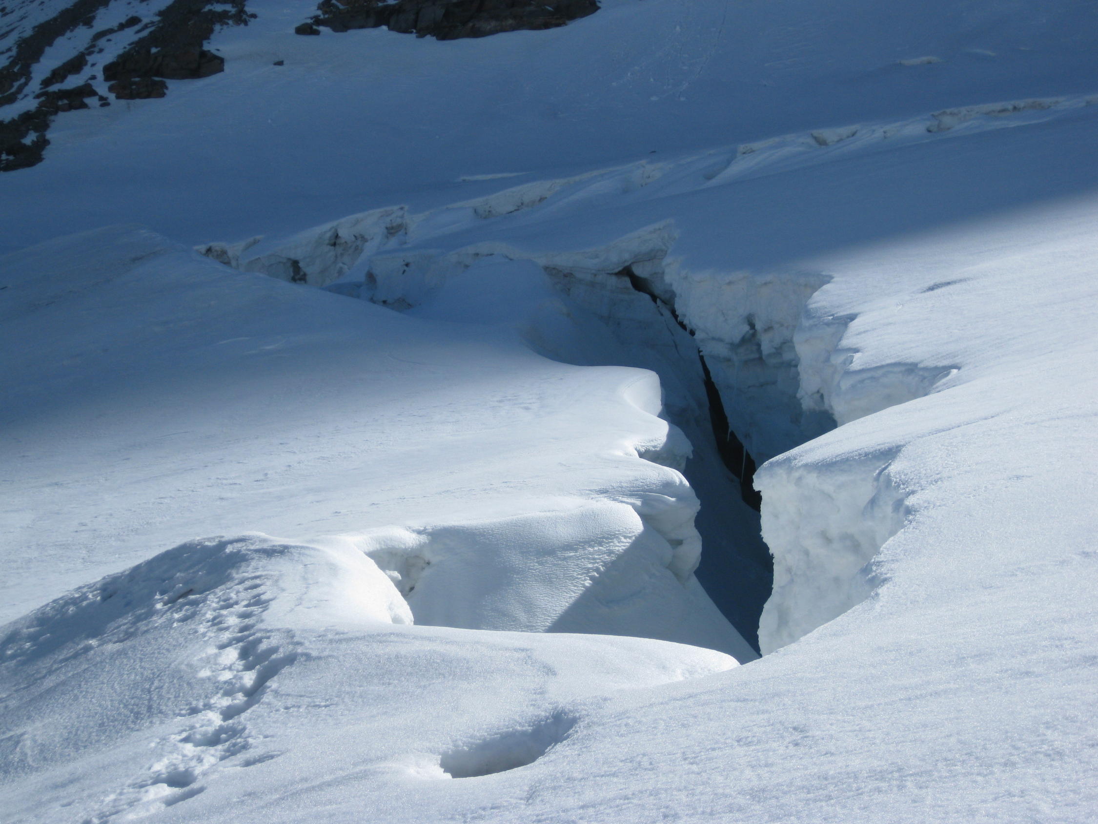Zahlreiche Restmengen von älteren Schneerutschen vom Bergschrund bis auf etwa 3300m abwärts vorhanden.