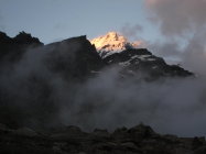Beste Bedingungen, aber Tälchen östlich des Berghotels Flue ziemlich sumpfig. Zwischen Pass und Gipfel einige Schneefelder.