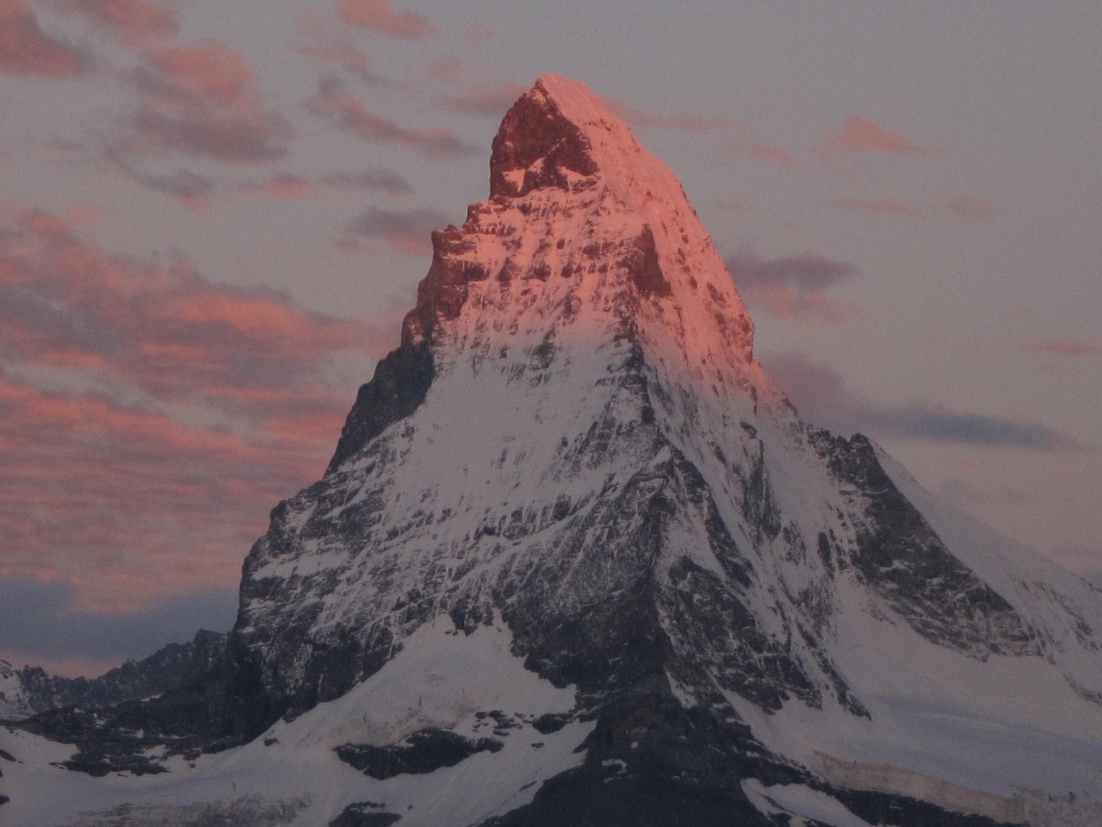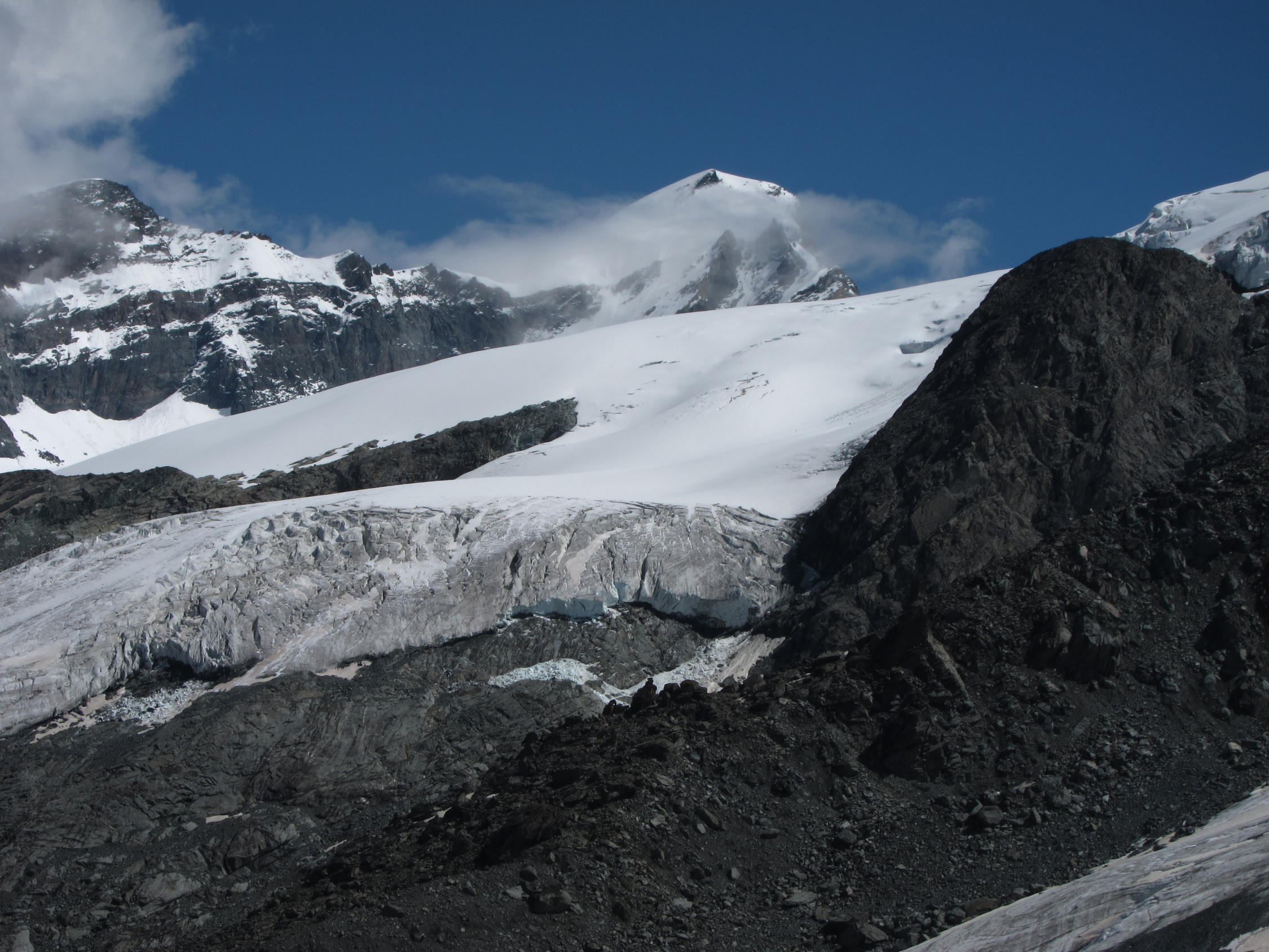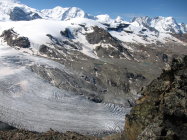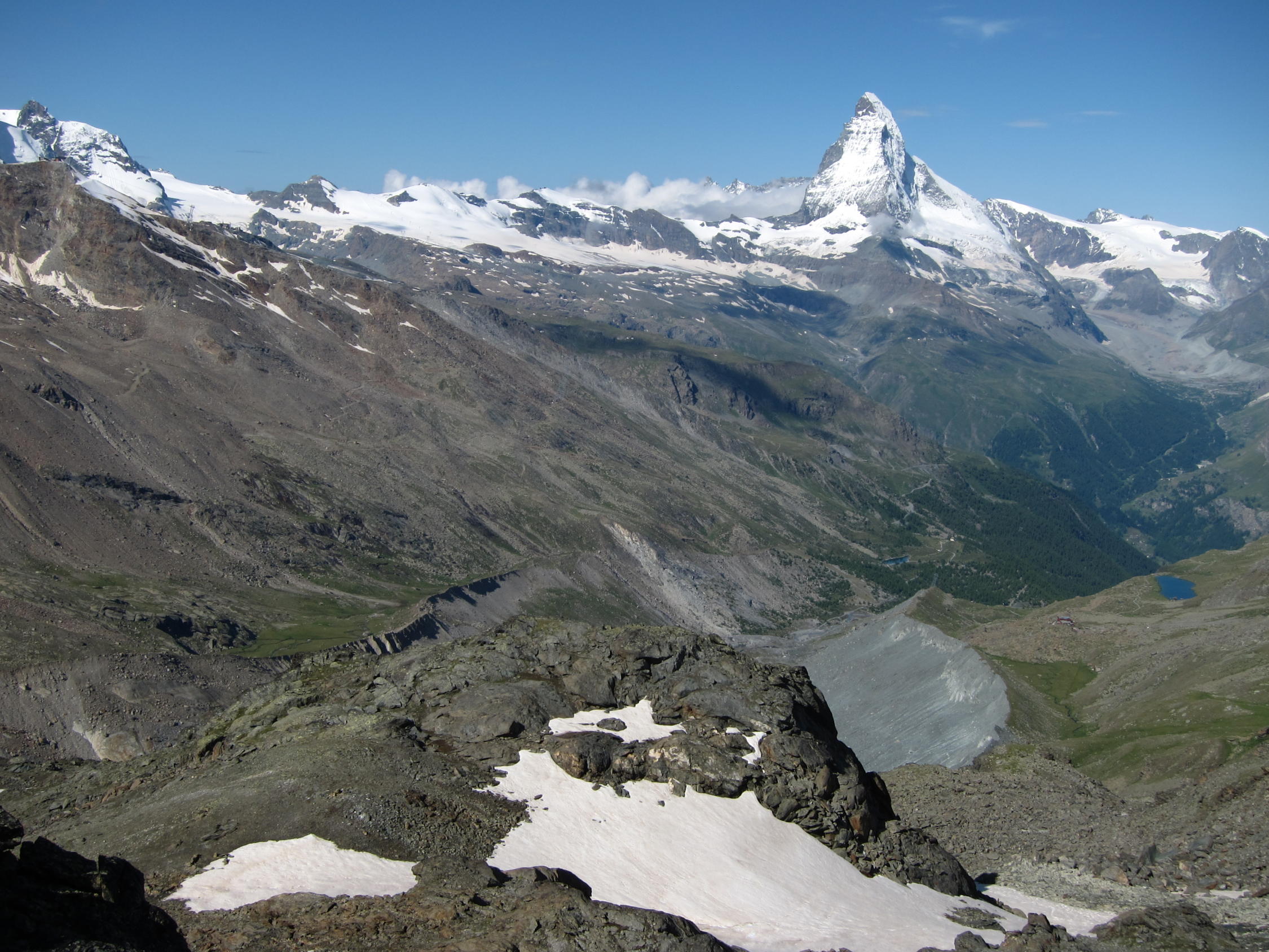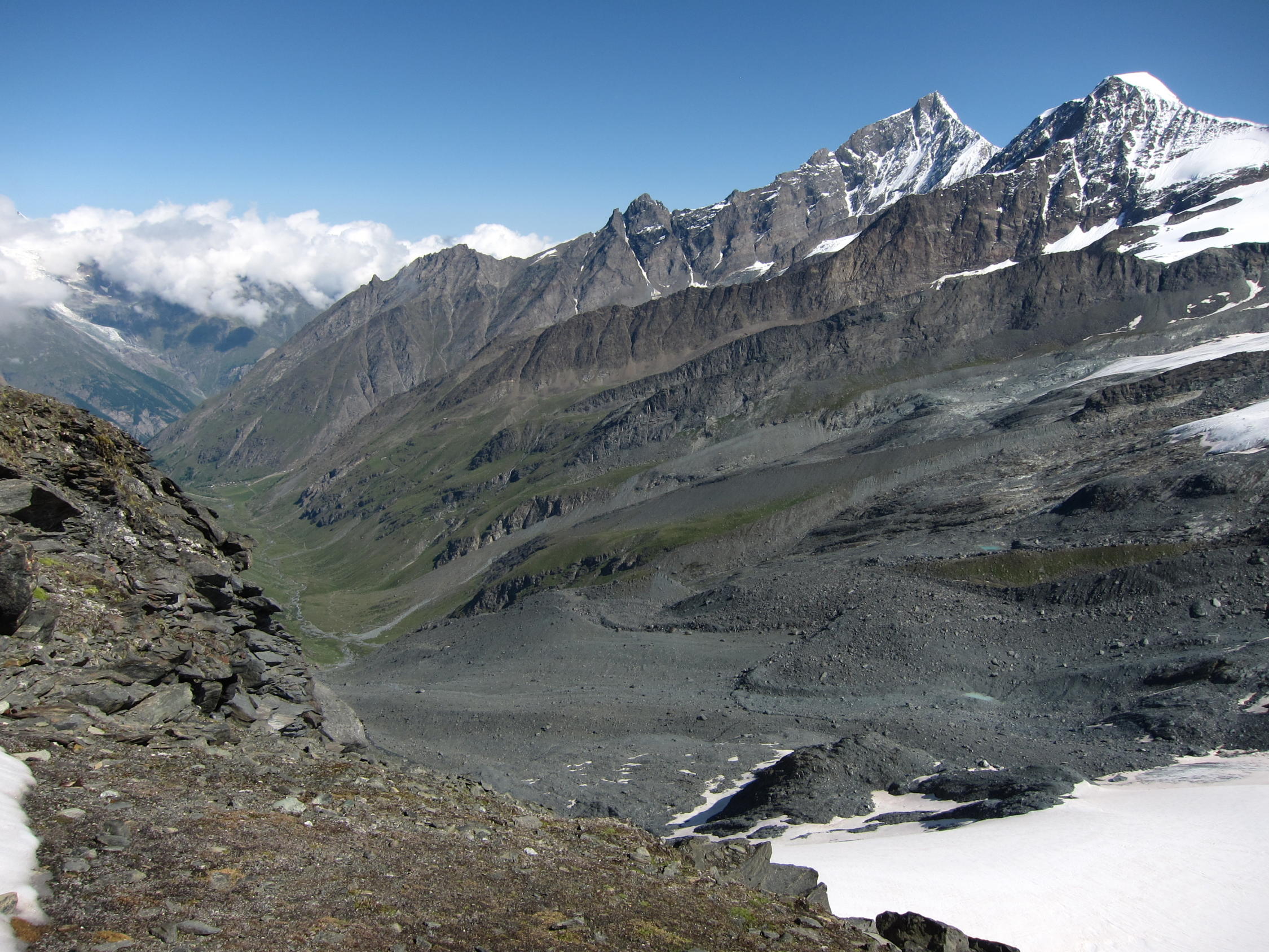 Vom Gipfel atemberaubene Tiefblicke zum Findelgletscher und beeindruckende Sicht auf viele Walliser Viertausender.