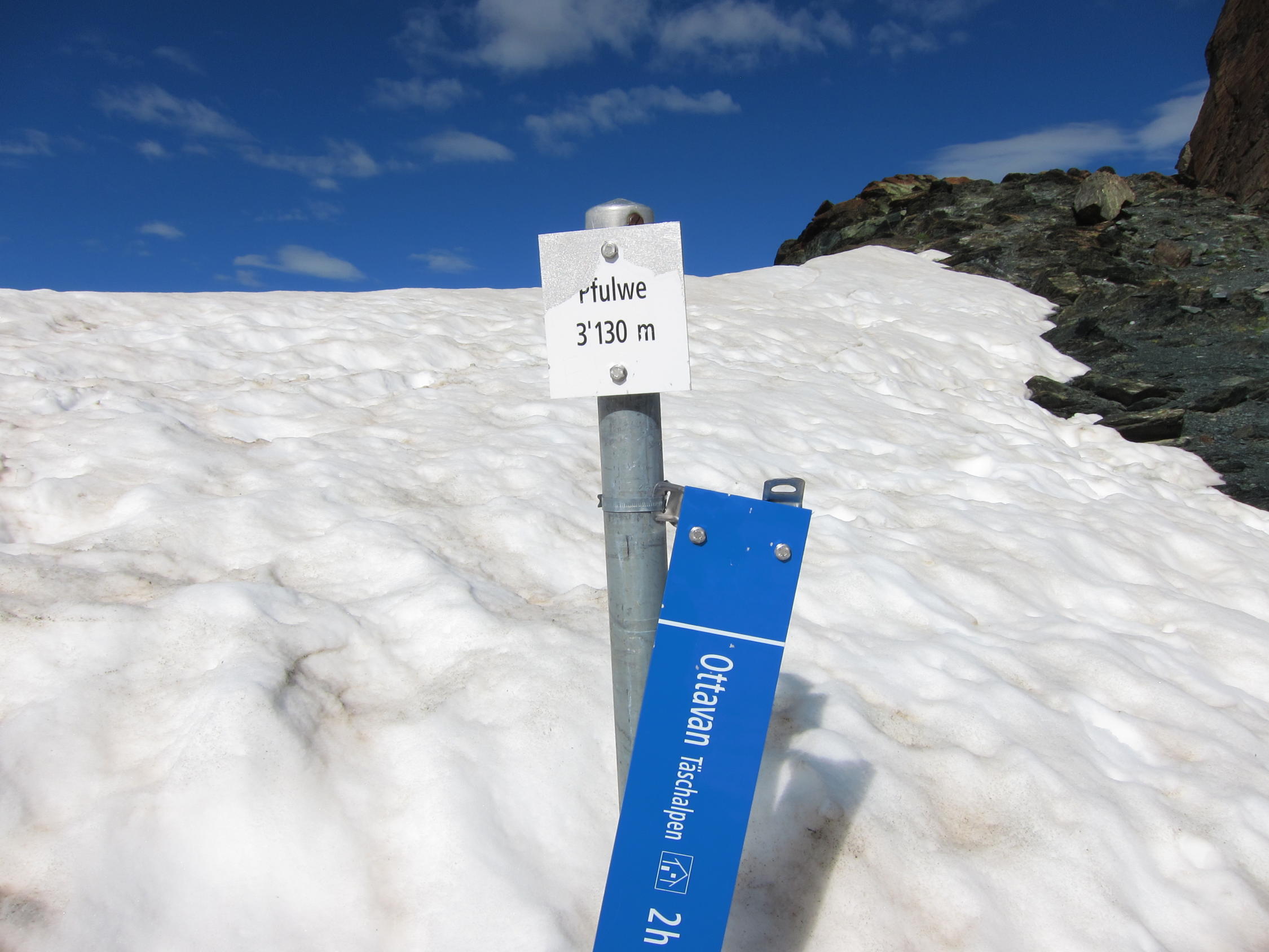 Vom Pfulwe-Pass auf sehr gut blau-weiss markiertem Weg zu den Täschalpen (Ottavan) absteigen, sodass der Abstieg auf ganz anderer Route erfolgen kann. Der Weg ist so deutlich und so gut markiert, dass er bei mir als rot-weiss durchgehen würde. Ich habe auf jeden Fall schon etliche rot-weisse Wege erlebt, die anspruchsvoller und v.a. gefährlicher sind.