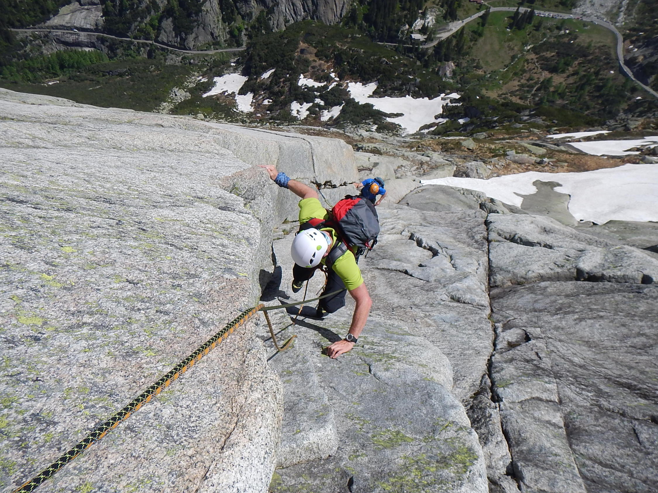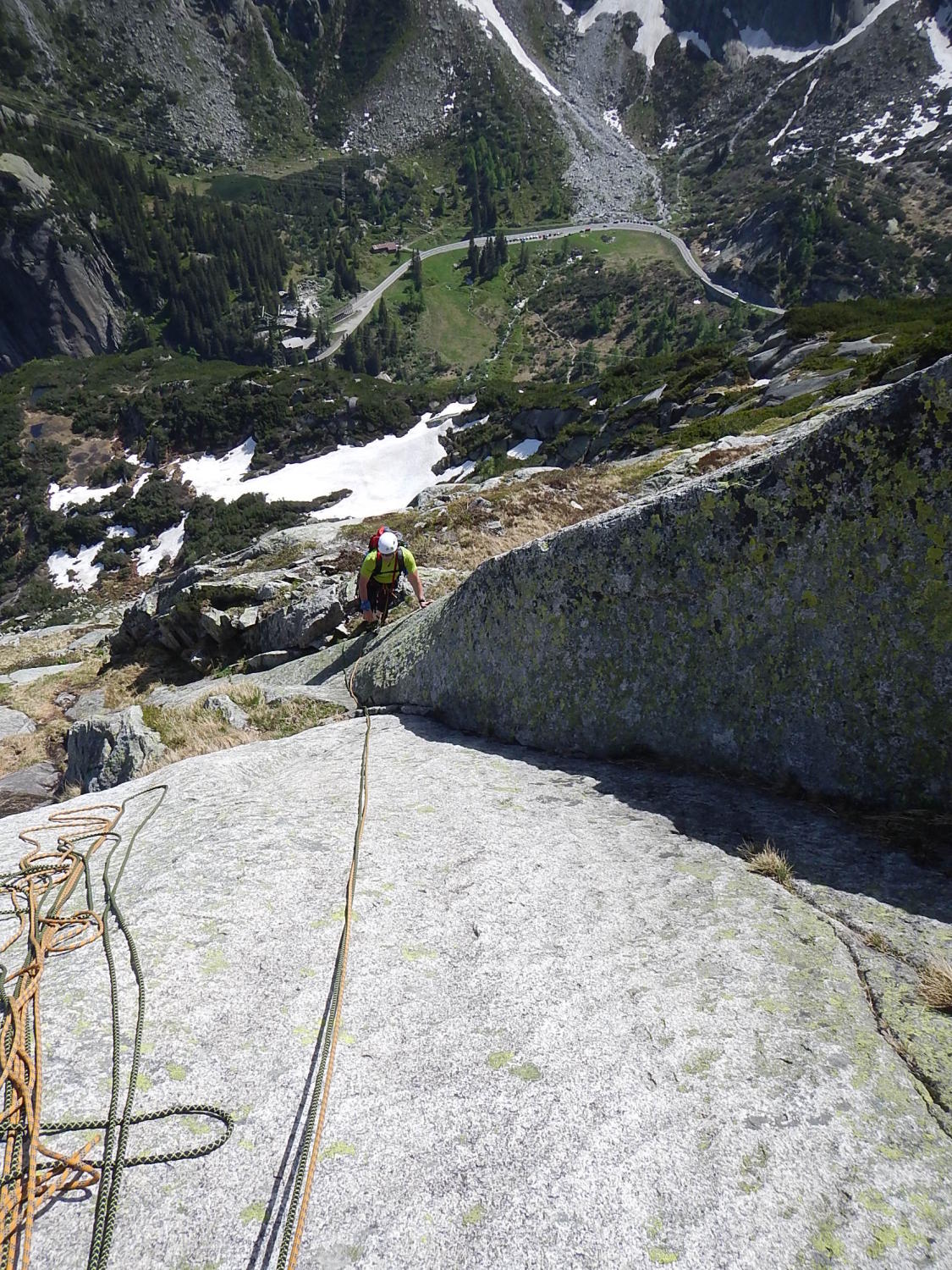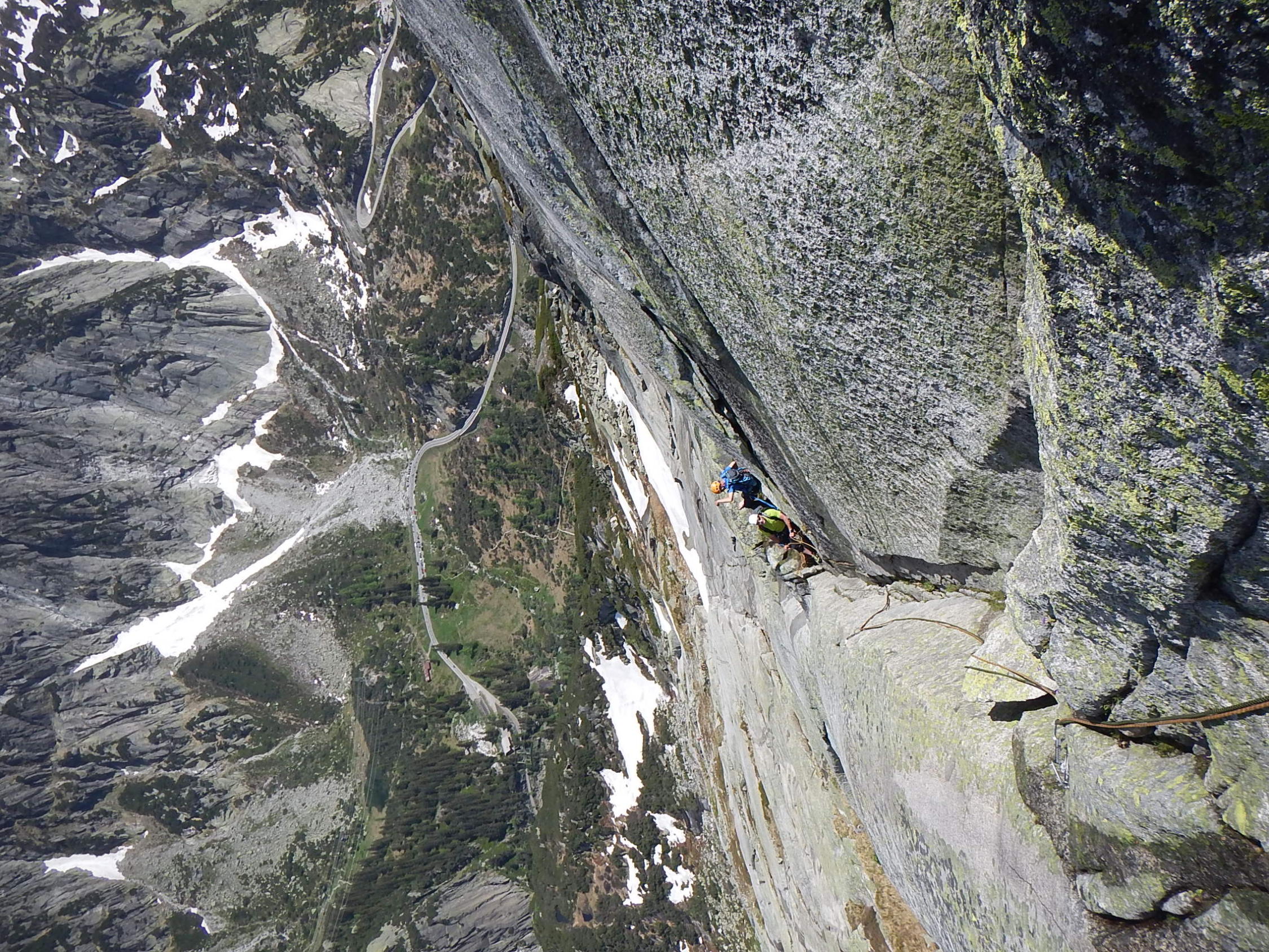 Tour hat effektiv Anfang Juni stattgefunden. Neben der Route lief viel Wasser, die Route selbst war aber nicht nass. Nur in einer der oberen Seillängen war entgegen der Filidor-Empfehlung zusätzlich ein Camalot 0.3 oder 0.4 notwendig, um vor dem Stand die nasse Verschneidung links zu umgehen.