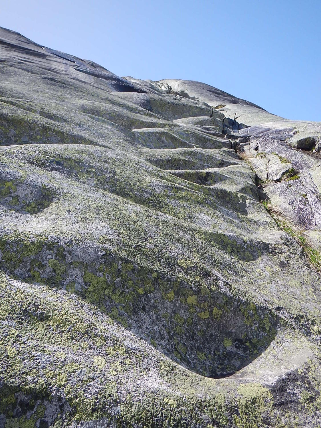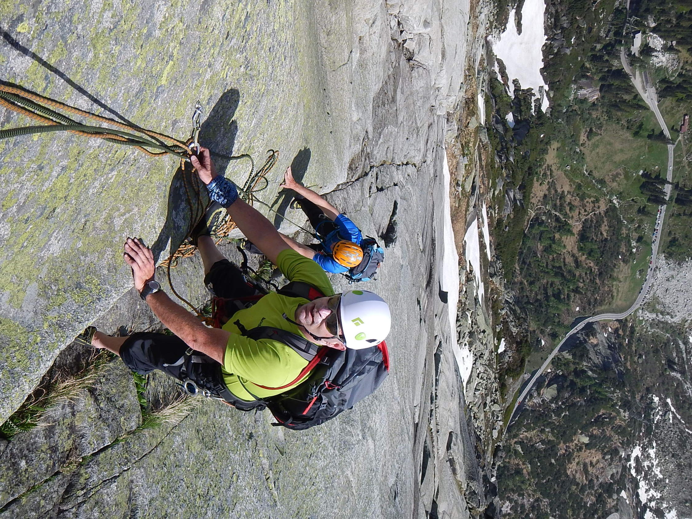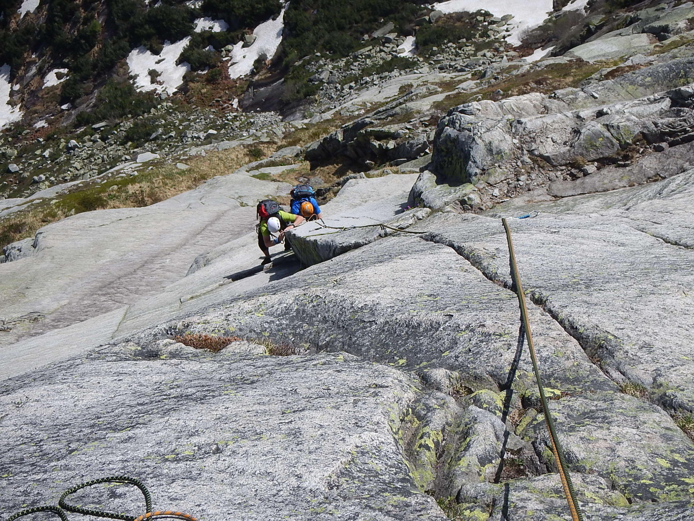 Tour hat effektiv Anfang Juni stattgefunden. Neben der Route lief viel Wasser, die Route selbst war aber nicht nass. Nur in einer der oberen Seillängen war entgegen der Filidor-Empfehlung zusätzlich ein Camalot 0.3 oder 0.4 notwendig, um vor dem Stand die nasse Verschneidung links zu umgehen.