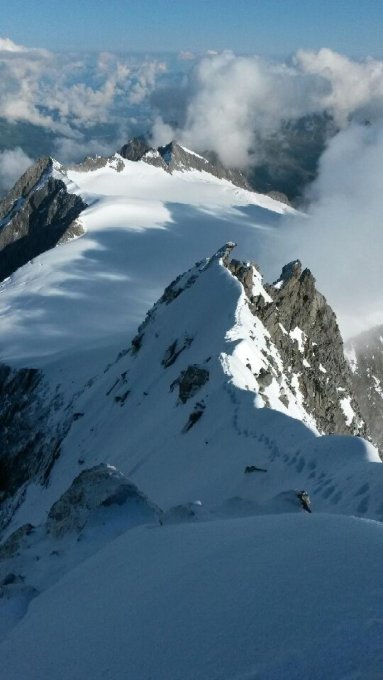 4 Uhr gestartet. Gletscher gut eingeschneit und tragend, ohne Schwierigkeiten auf vorhandener Spur bis zum Firnfeld des Vorgipfels (1 grossen, eingschneiten Spalt überquert). Im Firnfeld guter Trittschnee. Auf dem gesamten Verbindungsgrat wie auch weiter auf dem SW-Grat zum Dent-Blanche-Biwak viel Schnee, nach klarer Nacht zuvor hart und mit Steigeisen perfekt zu begehen. Viele Sicherungsmöglichkeiten an Zacken und Schuppen in den Felsen, wenige Bohrhaken und Abseilstellen sind vorhanden. Zeitbedarf Hütte-Biwak mind. 8 Stunden rechnen, wir hatten 8 1/2 Stunden.
