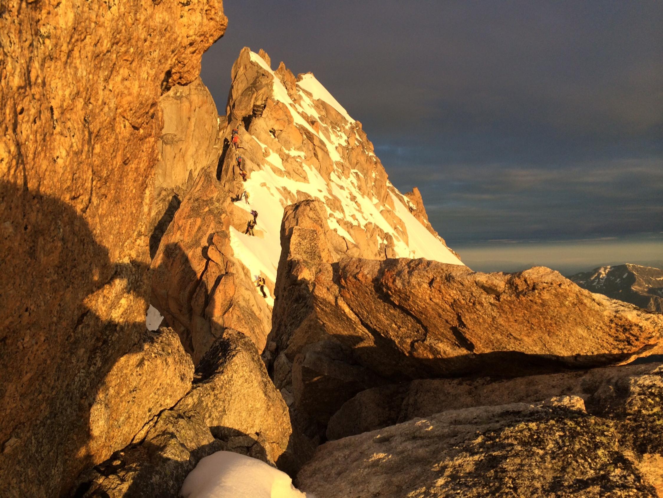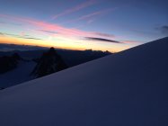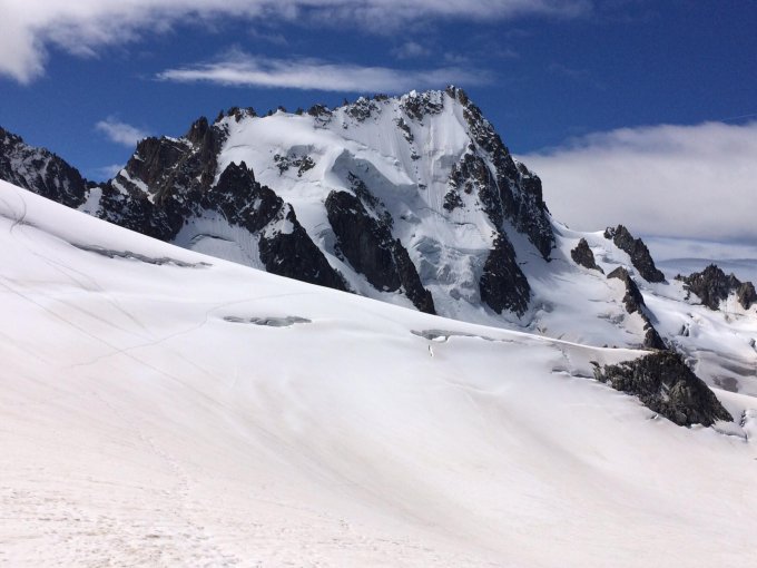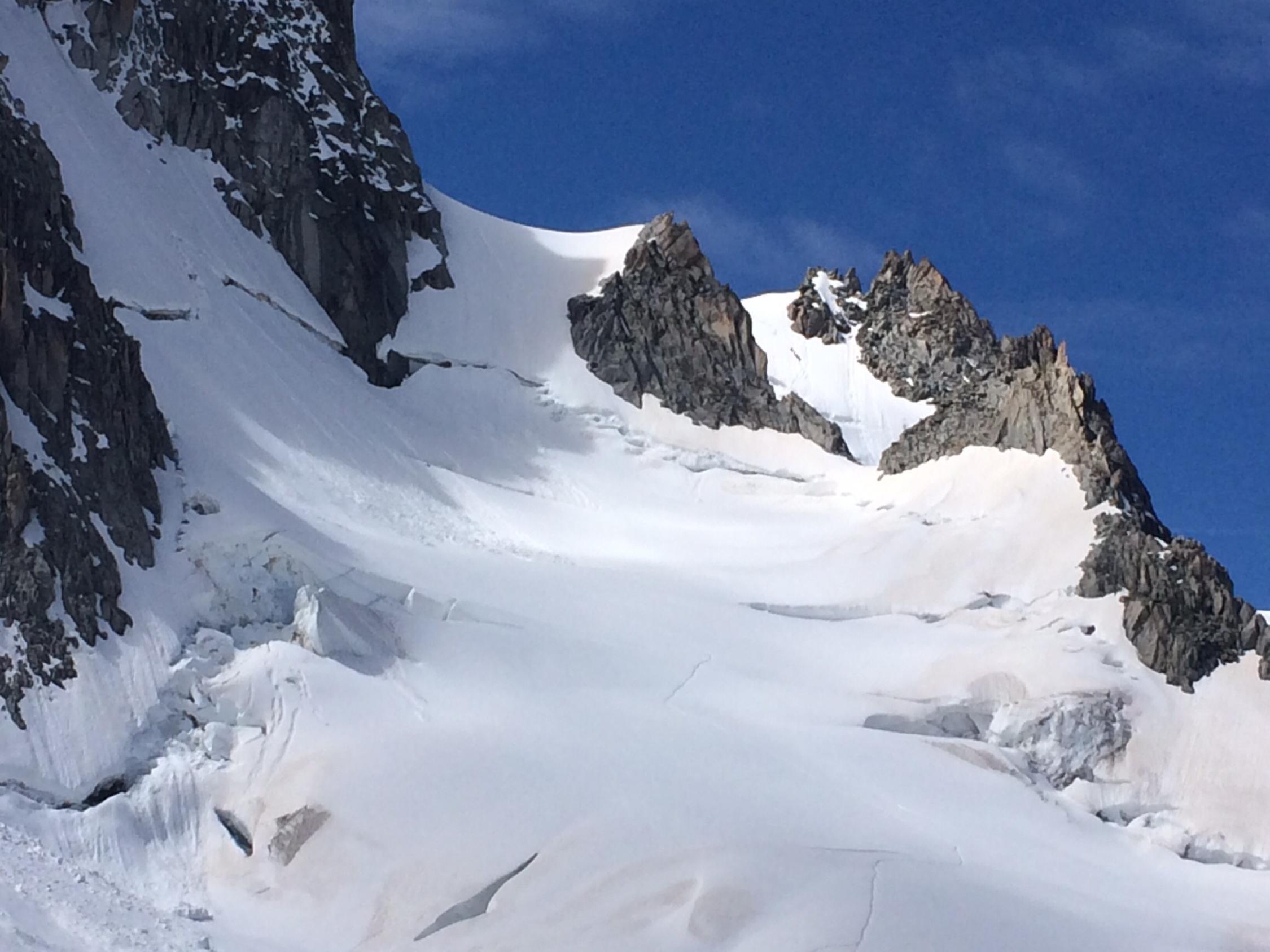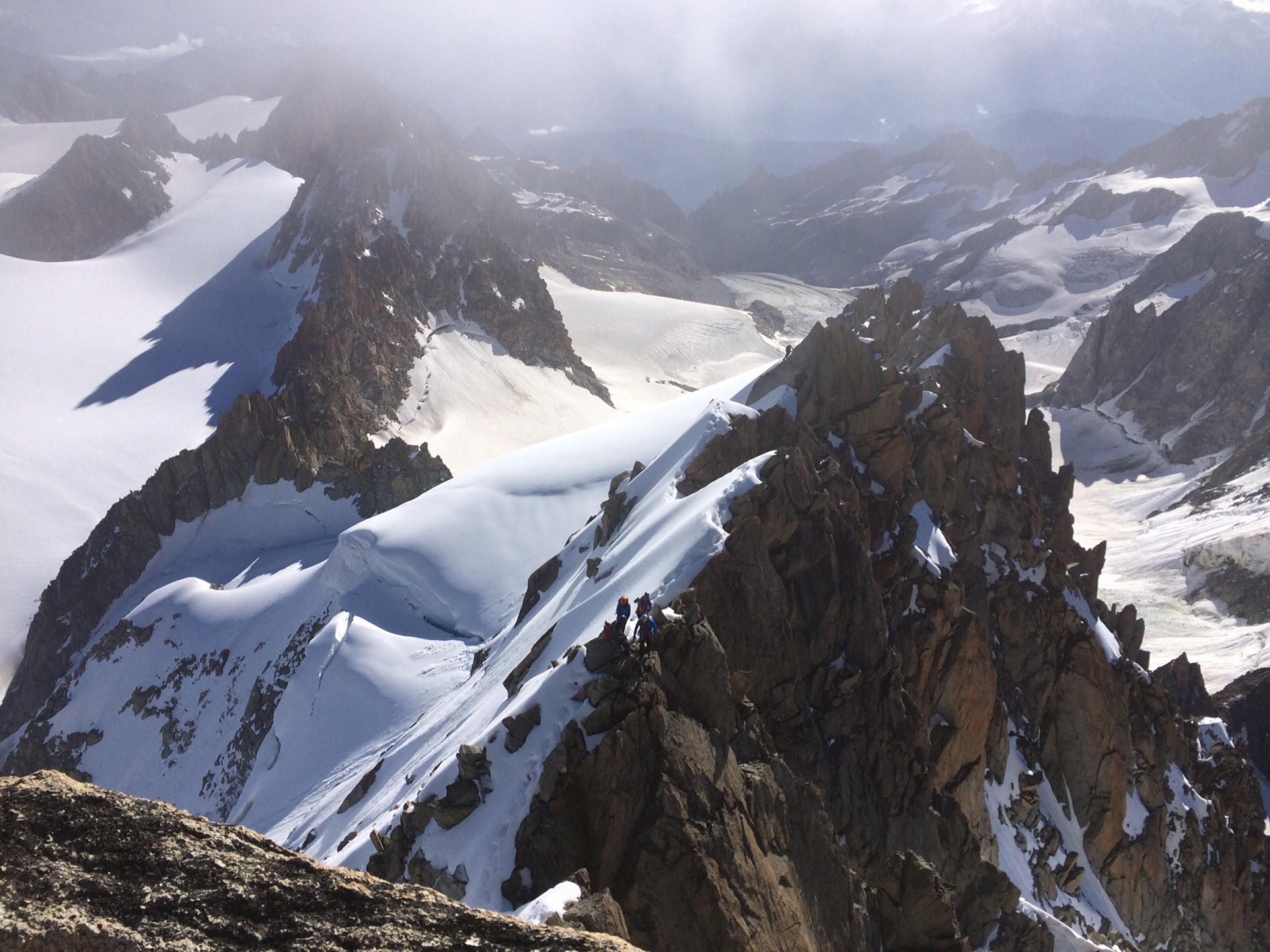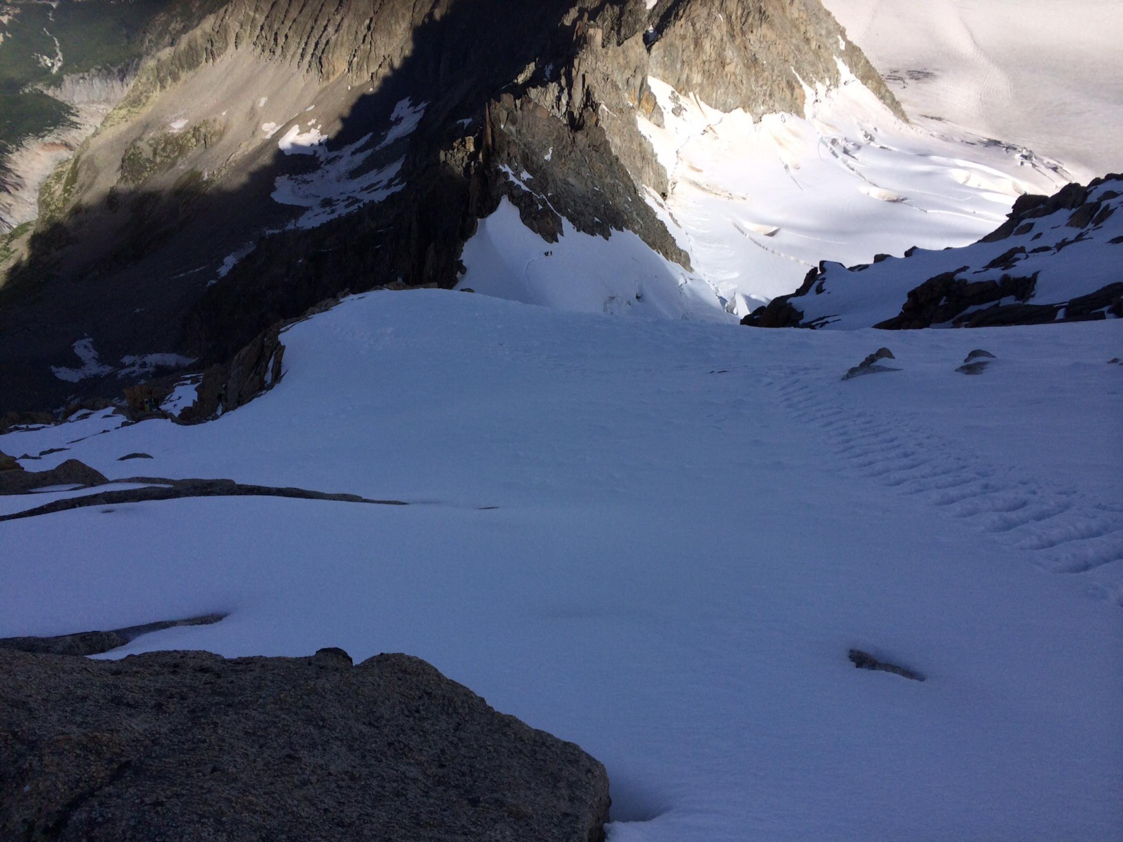 Verhältnisse Können nicht besser sein - Gute Stufen/Spur auf dem gesamten Gletscheranstieg bis zum Einstieg der Aréte Forbes. Felsen trocken, Firn am Grat perfekt. Abstieg Westgrat auf perfekter Spur, Bergschründe alle gut passierbar, im unteren Teil noch kaum blanke Stellen. Die für den Morgen angekündigten hohen Wolkenfelder verhinderten ein stärkeres Aufweichen des Grates.