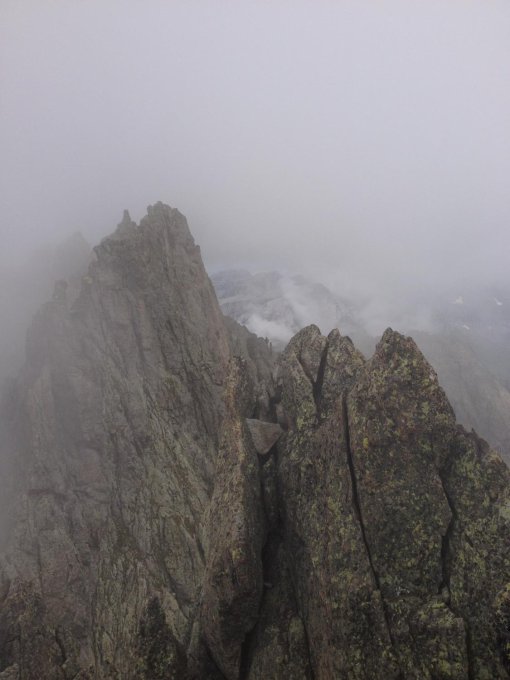 Einstiegsseillängen auf den Grat pflotschnass, dazwischen an immer mal mehr oder weniger (un)praktischen Stellen feucht und rutschig, scheint wohl noch am frühen Morgen geregnet zu haben und die Wolken behinderten ein zügiges Abtrocknen.