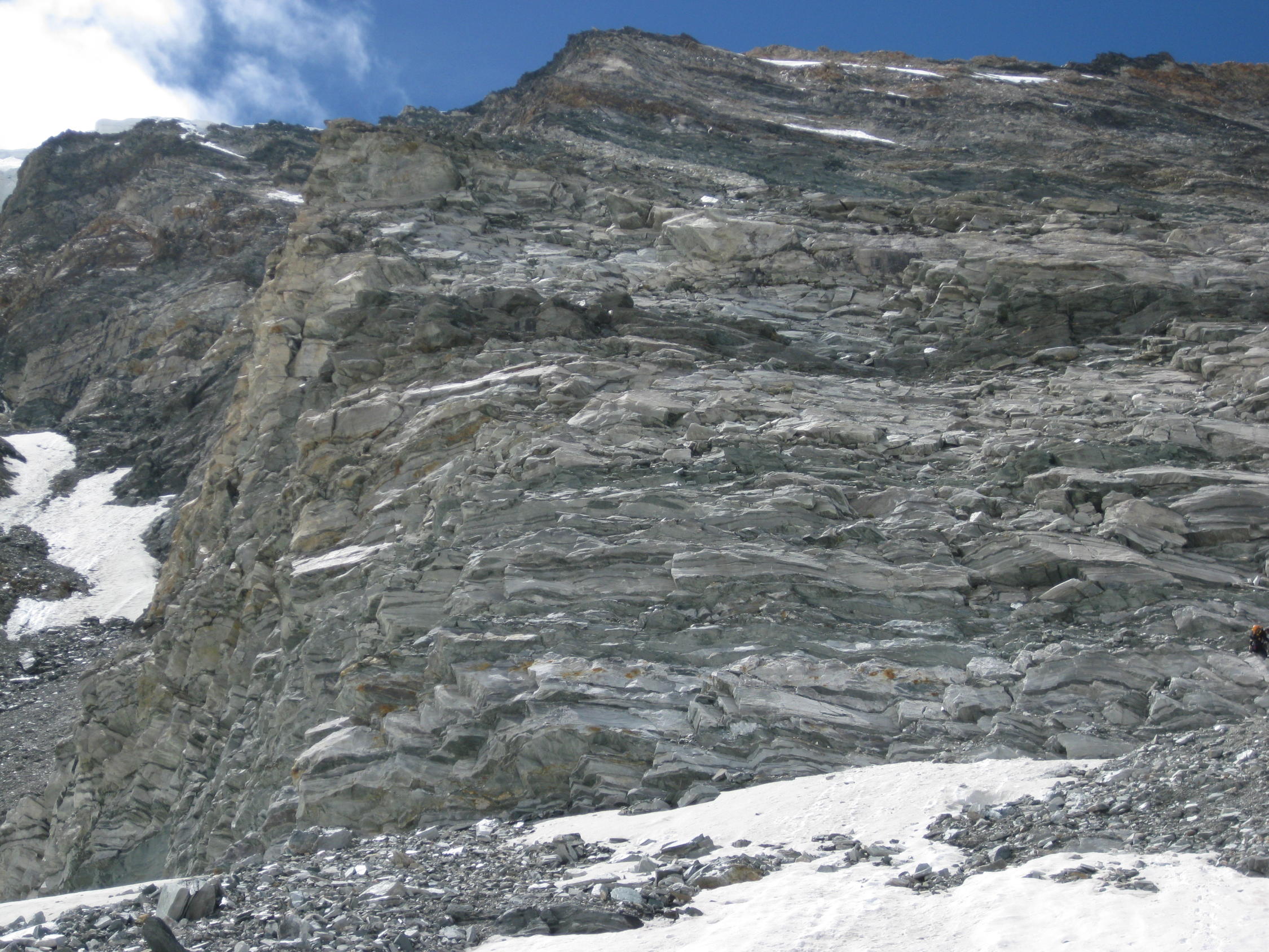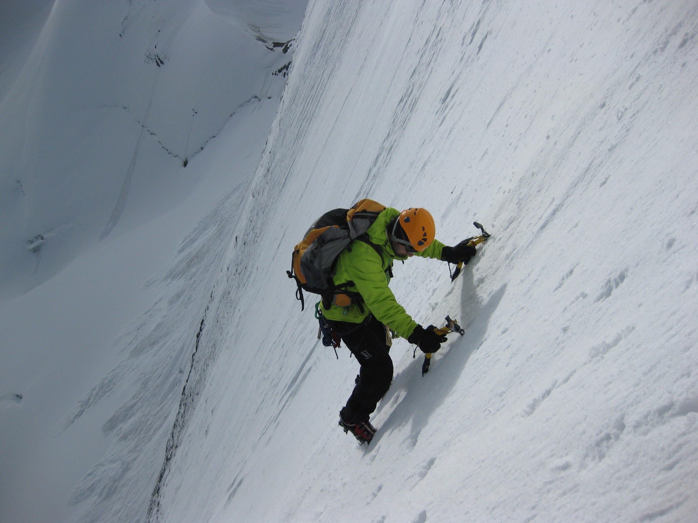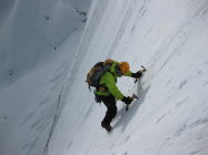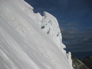 In der Wand herrschen gegenwärtig perfekte Bedingungen! Trittfirn praktisch von unten bis oben, einzig im untersten Teil (im Bereich des derzeit nur leicht felsdurchsetzten Stücks) trifft man auf kurze unschwierige Blankeisstellen. Ferner findet man in den ersten 2 Wanddritteln (bis zum obersten Schrund am Beginn der Gipfelwand) auch einige Feuchtschneepassagen vor (bis ca. 30 cm tief), die die Sache aber auch nicht wirklich komplizieren. Der Einstiegsschrund kann derzeit an mehreren Stellen überwunden werden, doch empfiehlt sich der Überstieg auf alle Fälle weit genug links vom großen Hängeserac (siehe Bildbeilagen), von dessen Eisschlagaktivität zahlreiche Eisbrocken am Brunegggletscher zeugen. Die Überwindung des Seracgürtels stellt aufgrund der starken Abschmelzung kein nennenswertes Hindernis mehr dar. Senkrechte oder auch nur annähernd senkrechte Passagen sind nicht mehr zwingend zu bewältigen. Auch die Überwindung der beiden Schründe im Mitteldrittel gelingt problemlos. Als Abstieg zur Turtmannhütte haben wir die Variante "Über den Mergasch" gewählt oder besser ausprobiert - eine Felsrippe, die von P. 3544 vom Turtmanngletscher auf den Brunegggletscher hinabführt und im neuen SAC-Führer Walliser Alpen "Matterhorn..." als "abwechlungsreiche Alternative" (!) vorgestellt wird. Tatsächlich führt dieser "Weg" durch extrem brüchiges und steinschlaggefährdetes Gelände mit ausgesetzten Passagen und nicht immer leichter Wegfindung. Dieser Steig ist absolut nicht empfehlenswert und trübt den Eindruck der Gesamtunternehmung! Besser über die Tracuithütte und den Turtmanngletscher zur Turtmannhütte absteigen.