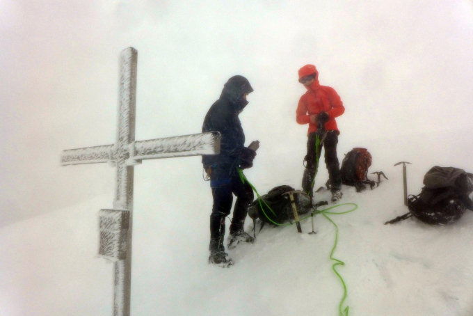 Allgemein schwierige Verhältnisse ab 3400m. Bei geringer Abstrahlung aufgeweichter, knietiefer Nassschnee schon am frühen morgen. Ab 3700m 5 cm Neuschnee. Wintersturm am Gipfel. Das Aletschhorn macht seinem Ruf als kältester Berg der Schweiz alle Ehre.