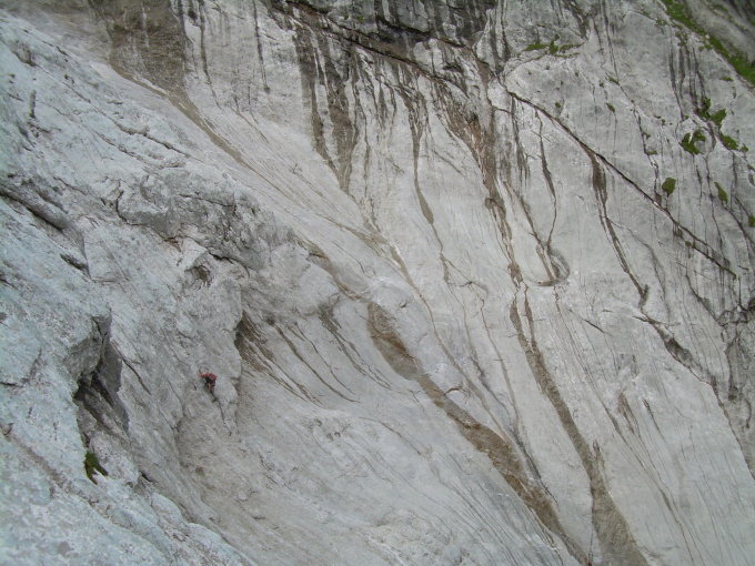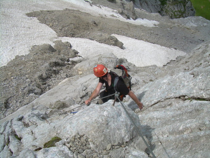 Wenn man auf dem Wanderweg zum Schweizertor unterwegs ist, sollte man unbedingt das Augenmerk auf eventuell dort aktive Kletterer richten und die Ohren spitzen. Bei unserer Rückkehr waren einige Seilschaften in großer Höhe direkt überm Wanderweg zugange. Einen Moment lang habe ich noch überlegt, den Steinschlaghelm nochmals aufzusetzen, beließ es aber bei einem zügigen Durchgehen der Passage. Nur wenige Minuten später krachte es prompt, zwei große Brocken stürzten auf den Weg herab. Da hätte auch der Helm nichts mehr genutzt, glücklicherweise war unten gerade niemand unterwegs