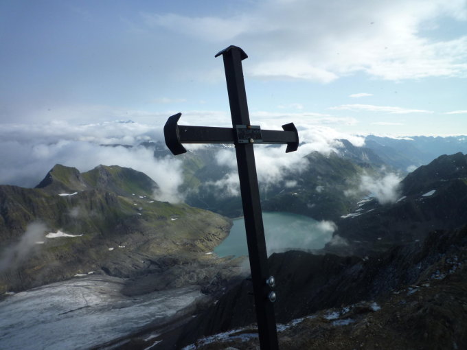 Schnelle Wetterverschlechterung und kleinen Schneeschauer und Wind am Gipfel.