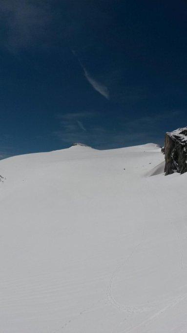 Es war einfach traumhaft, keine Unebenheiten und eine ganz feine Schicht Triebschnee. Auch der Felsriegel war gut zu klettern. Wir konnten direkt ab der Station losgleiten. Am Gipfel hatten wir mässigen Westwind, zum Glück, so war es doch nicht all zu warm.