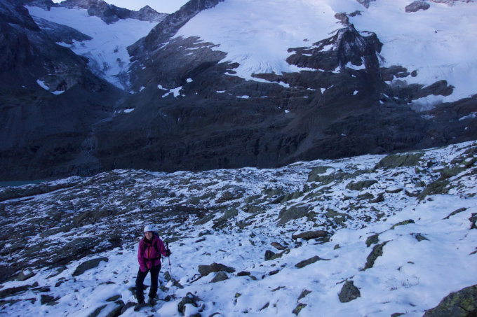 Am 14.08 hat es sehr viel Neuschnee gegeben, der sowohl im Aufstiegsbereich als auch im Grat liegen geblieben ist und insbesondere im Aufstieg zu Vereisungen geführt hat. der Grat selbst war trotz Schnee ok. der 17.08 war jedoch sehr sonnig, so dass mittlerweile fast aller Schnee weg sein sollte. Siehe Bilder. Firnhang in der Normalroute ohne Eis.