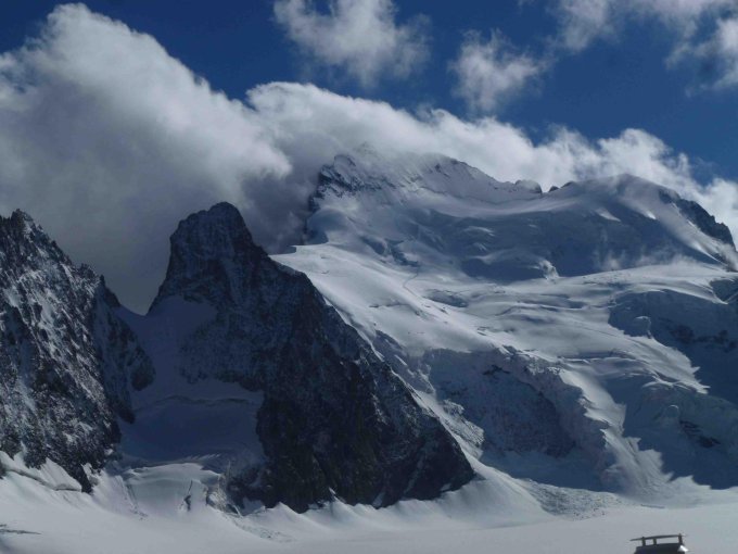 Auch hier z. Zt. beste Verhaeltnisse! Und das Wetter passt! Zum Dome de Neige ohne Probleme. Auf den Hauptgipfel im Aufstieg aktuell gut über die Firnflanke hinauf auf die Schulter oberhalb der Lory, der Bergschrund hält aber wohl nicht mehr so lange... Im Abstieg besser zur untersten (!) Abseilstelle über der Breche queren und dort 10 Meter abseilen. Der Aufstieg ist im unteren Teil stark dem Eischlag der Eisbrüche ausgesetzt. Augen zu und durch...