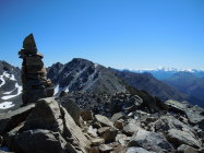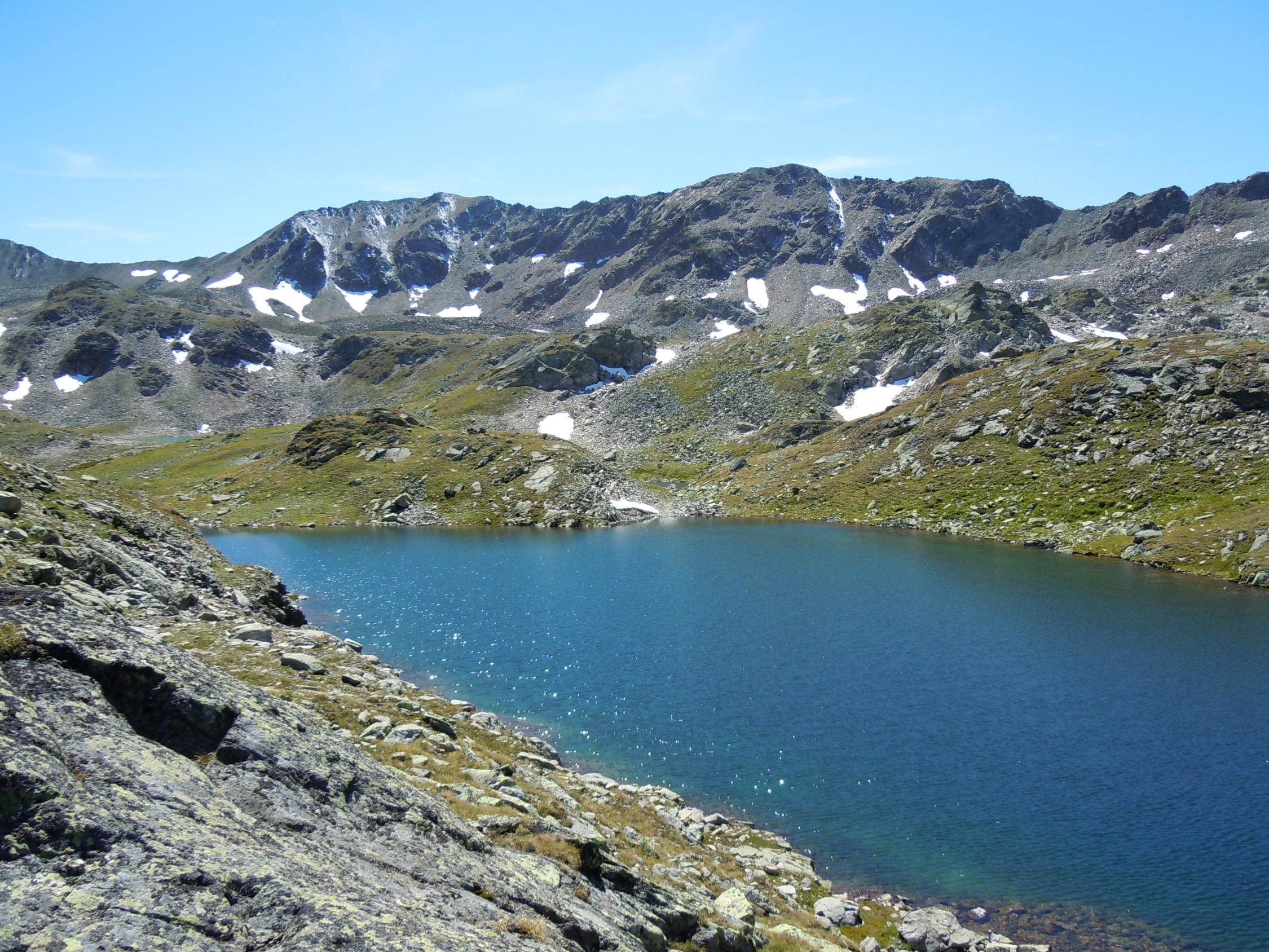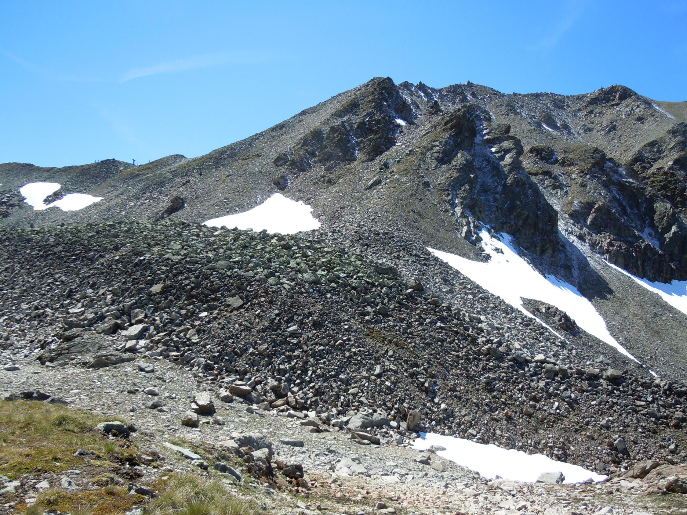 Abstieg über den Blockgrat gegen Osten zur Fuorcletta da Barcli, 2850 m, wo der Weiterweg gegen Norden über Geröll und Steinblöcke, z.T. Schneefelder, gegen die Seenplatte führt.