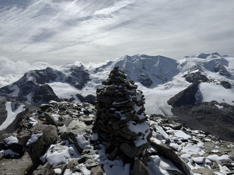 Familientour auf den beliebten Aussichtsgipfel über dem gleichnamigen Gletscher, T3+. ÖV Tour. Start Bergstation Diavolezza, 10 Uhr, CHF 45.00 retour. 0 Grad, eisiger Nordwind, leicht bewölkt. Der alpine Wanderweg hatte an einigen Stellen etwas Schnee, sonst ohne Probleme zum schönen Aussichtspunkt mit dem grandiosen Bernina-Panorama. In der Südflanke windstill und auch die Wolken sind verschwunden. Abstieg wie Aufstieg.