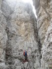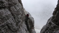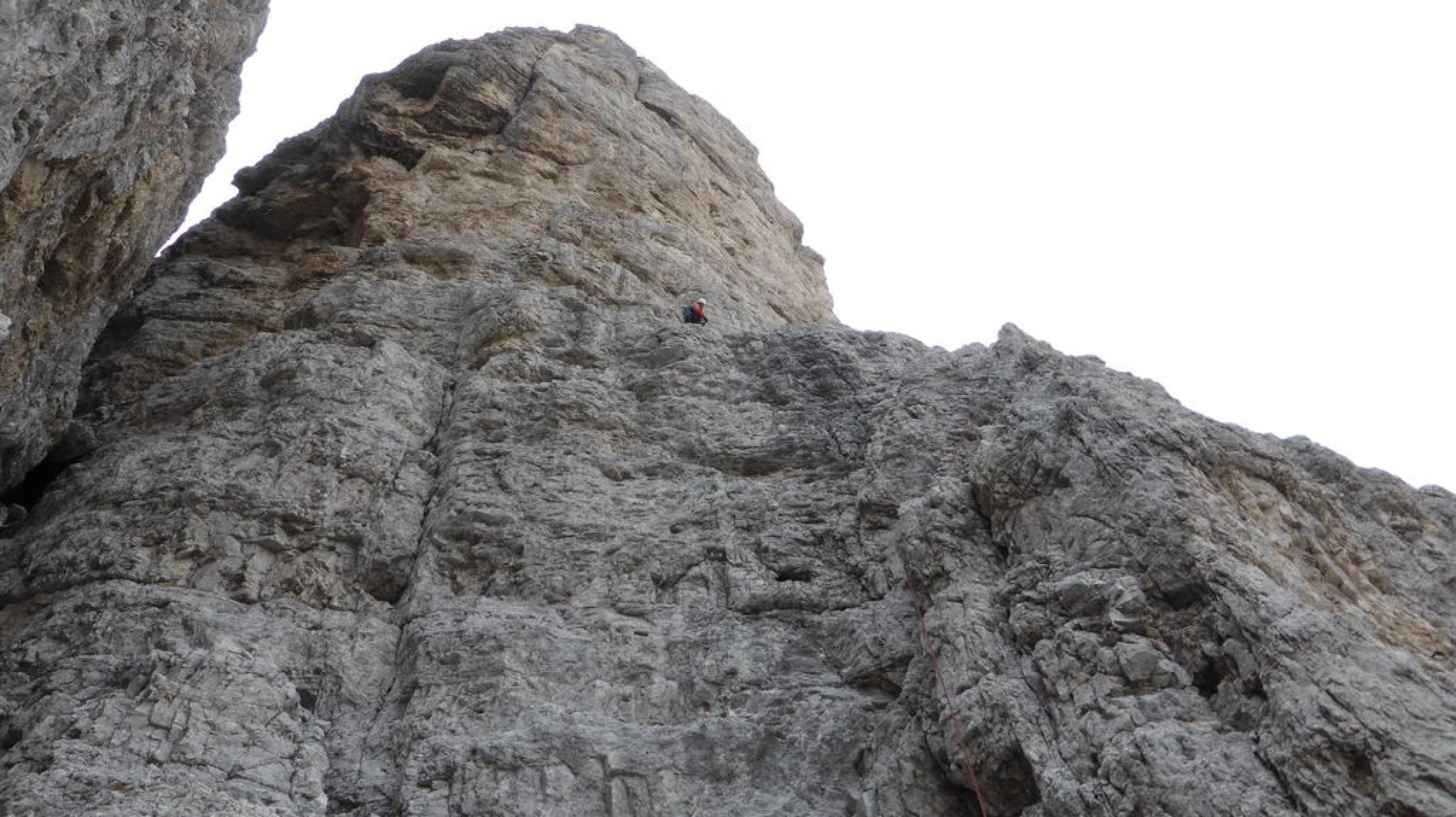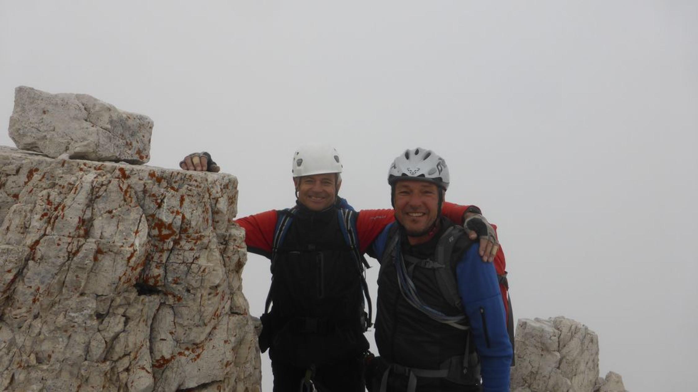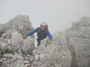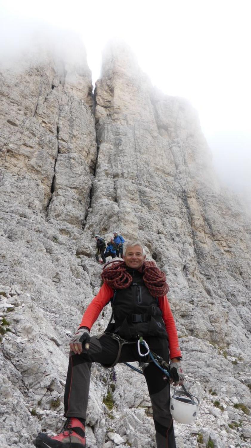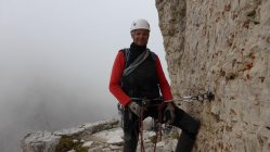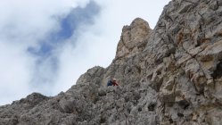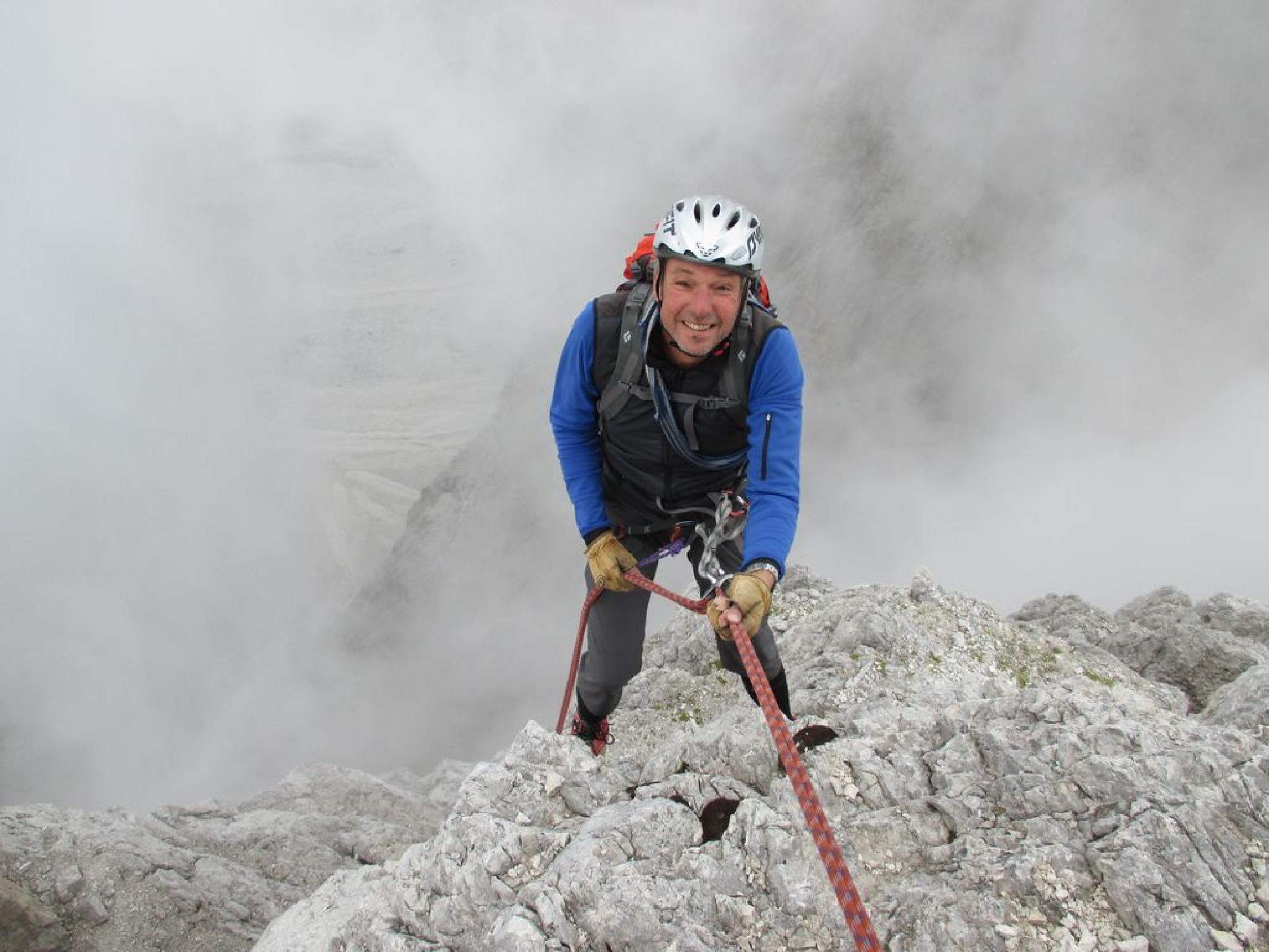 Wir hatten noch ganz passable Wetterverhältnisse. Es herrschte mehr feuchte Luft im Rosengartengebiet, als am Vortag, an dem wir bei blauem Himmel über den Südgrat auf die Rosengartenspitze kletterten (Bericht folgt noch). Die Türme und auch das ganze Gebiet waren mit wechselnd dichten Nebelschwaden umhüllt. Es war nicht klar, ob es schon bald zu regnen beginnt. So kletterten wir von Standplatz zu Standplatz mit der Gewissheit, das wir jederzeit auch in der Aufstiegsroute den Rückzug antreten konnten. Die Abstände der Standplätze waren dafür optimal eingrichtet. Es ging eine Seillänge um die andere höher und auf einmal waren wir auf dem Gipfel.