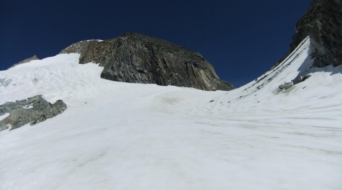 Denn entgegen jener Beschreibung befinden sich dort die meisten Spalten und ein Gletscherbruch im inneren Bogen des Fieschergletschers um das Rotloch südlich unterhalb des Finsteraarrothorns. Vielmehr verläuft spaltenärmere Aufstiegstour im großen Rechtsbogen mit maximalem Umfang wie oben beschrieben.