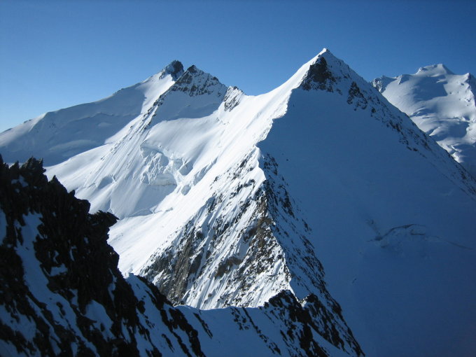 Auf dem Nadelgrat liegt noch viel Schnee und an den Firngraten muß man auf Wechten achten. Seit dem letzten Schneefall am Mittwoch 13. Aug, welcher 40-50cm Neuschnee brachte, haben ein paar Seilschaften den Grat gemacht, so dass gute Spuren vorhanden sind, welcher der Wind aber wieder schnell verblasen kann.