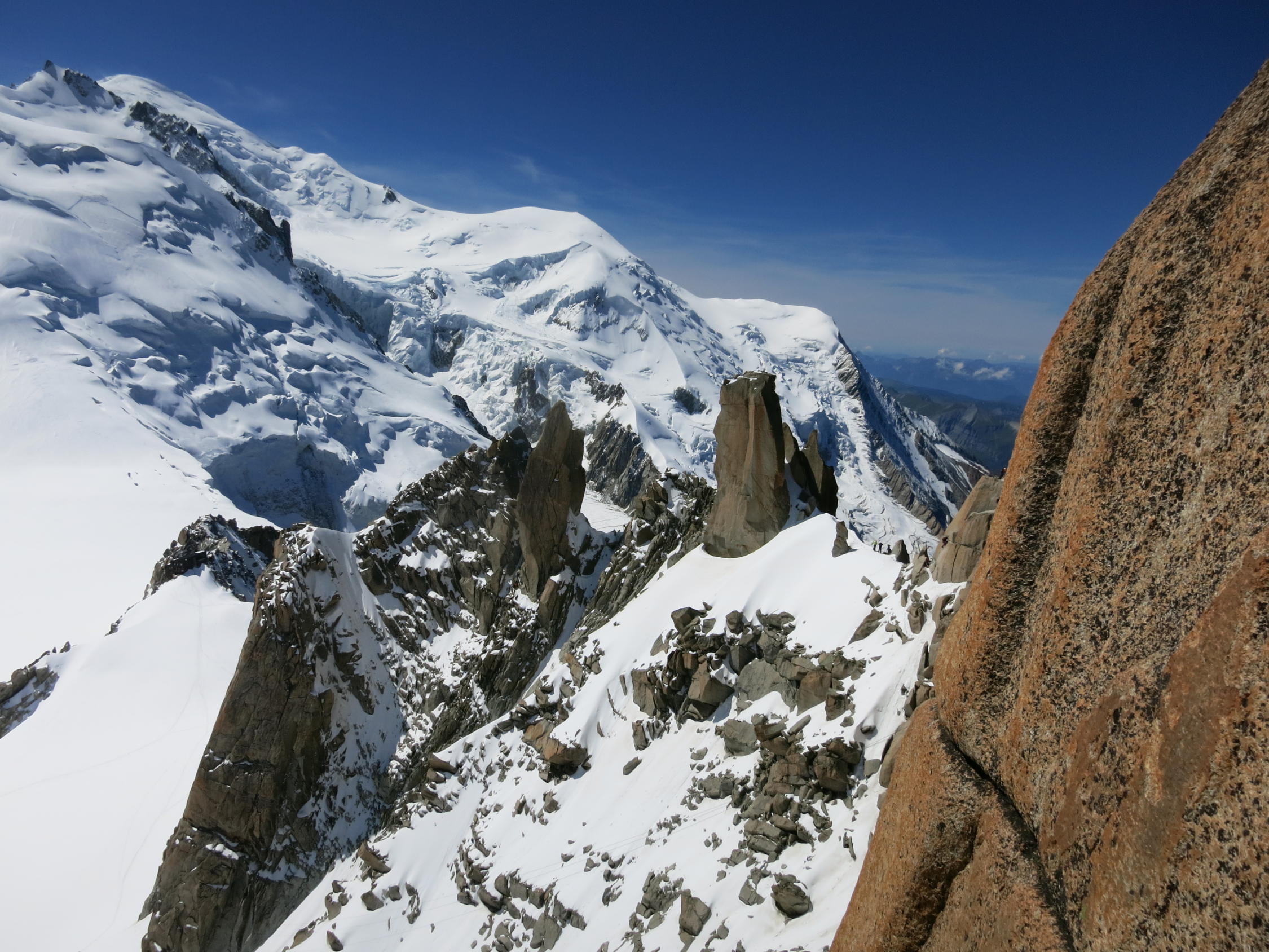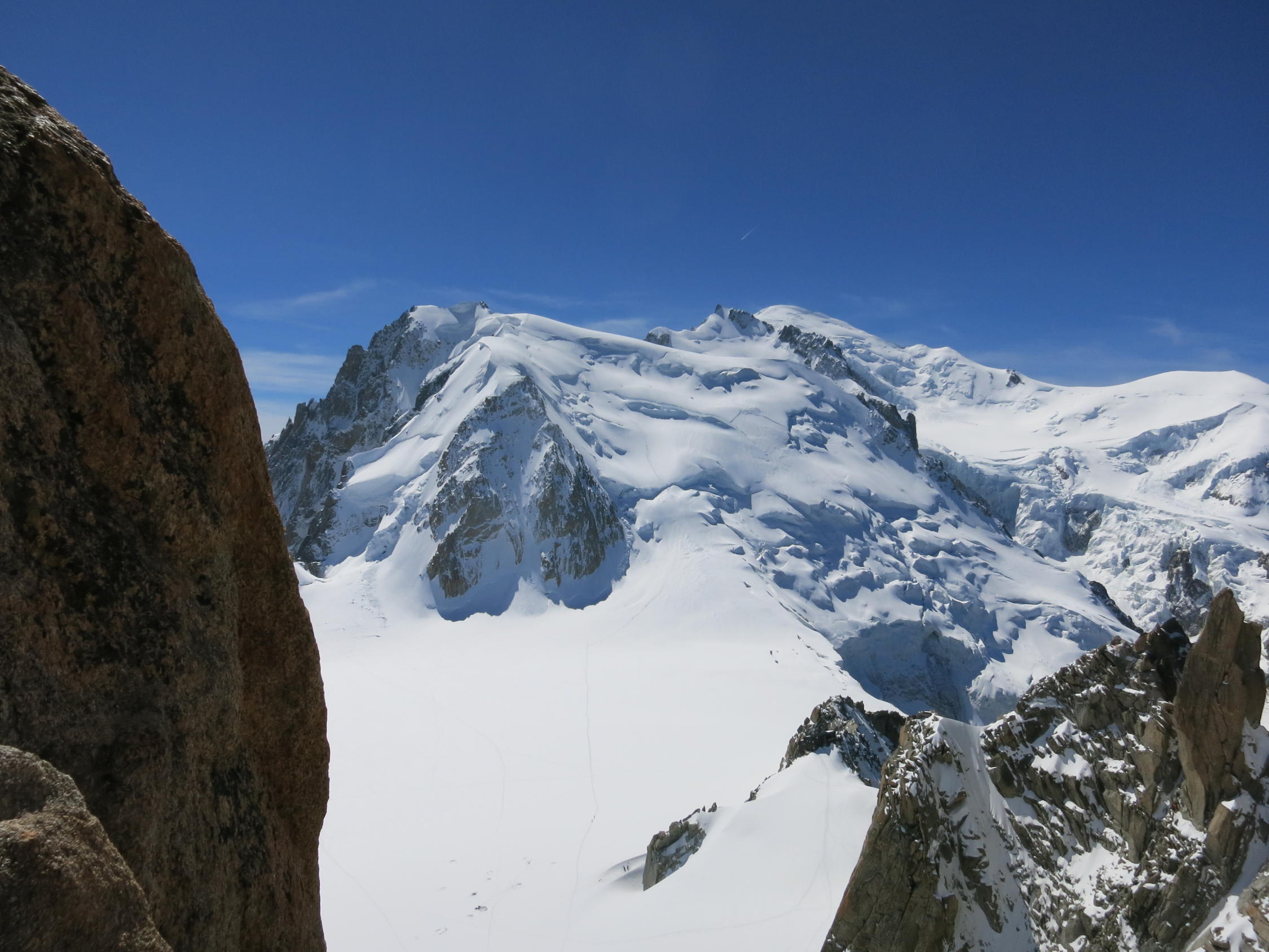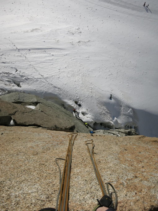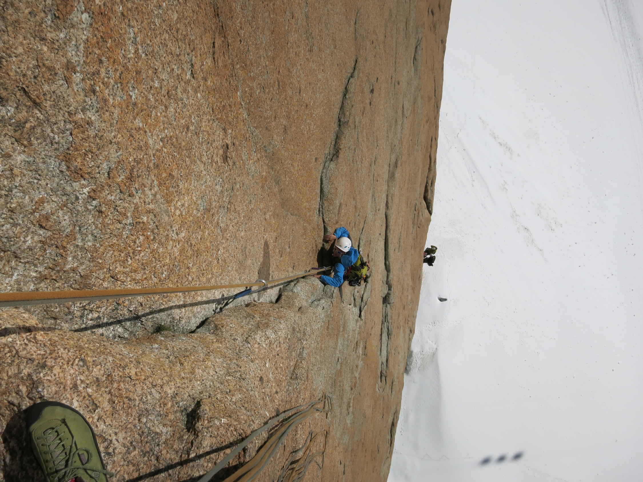 Insgesamt viel Schnee im Gebiet und sehr kalt. Wir sind trotz Sonne ständig in dicken Jacken geklettert. Überall noch viel Schnee, wobei die Verhältnisse z.Z. durch endlich mehr Sonne wieder sommerlicher werden. Allerdings werden in den großen Routen leider sicher noch länger kombinierte Verhältnisse bestehen bleiben. Haben sogar Skitourengeher auf dem Weg runter von der Aiguille du Midi getroffen!