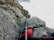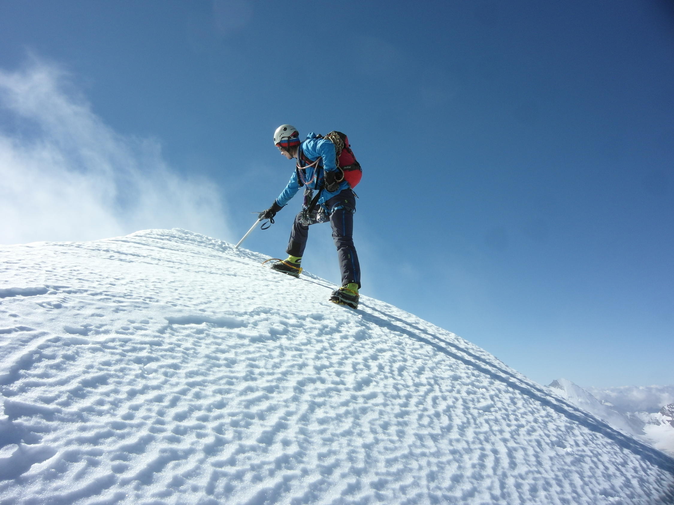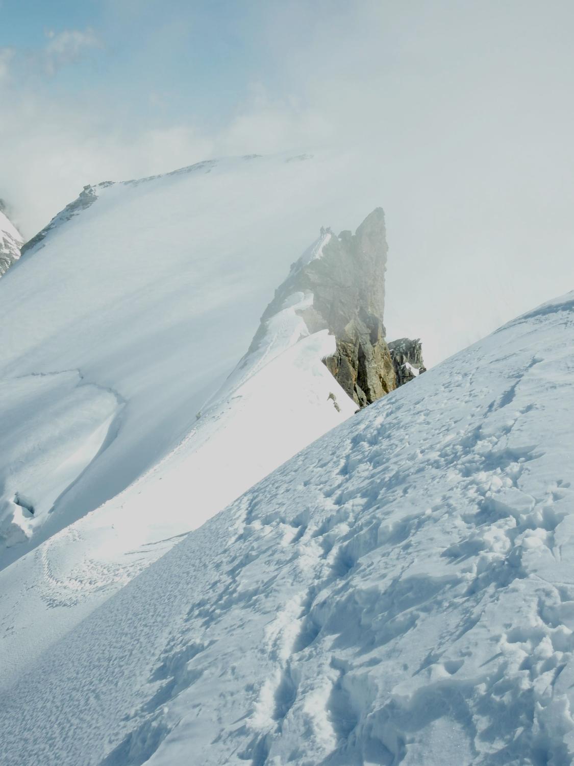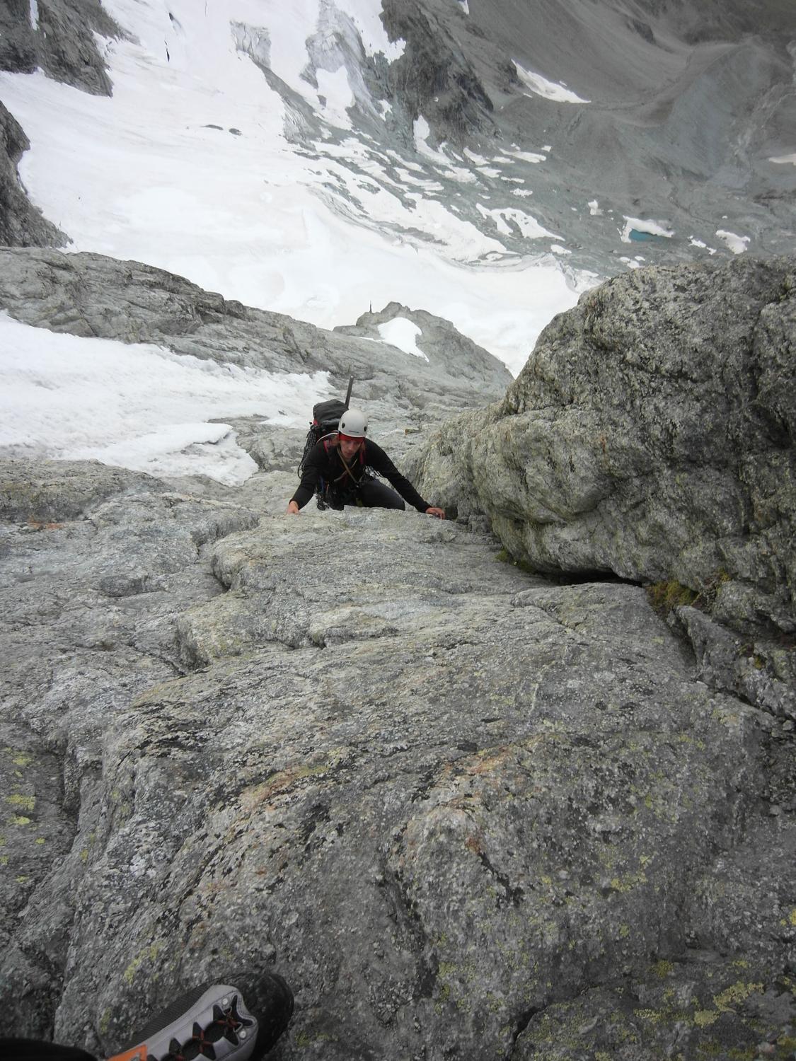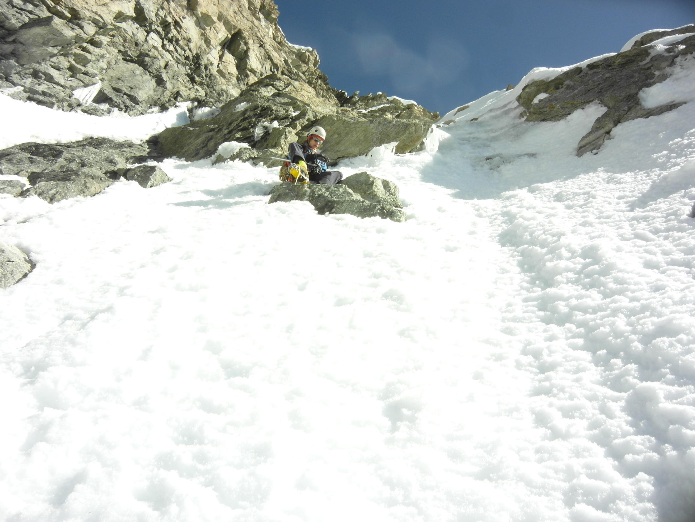 Morgens los um 05:40. Über Firnfelder hoch zum Einstieg. Nach ein paar Diskussionen haben wir auch den richtigen Pfeiler zum Einstieg gewählt. In der Wand perfekte Verhältnisse. Trocken und kalt. Kein Steinschlag. Die ersten zwei Drittel der Wand seilfrei gestiegen / geklettert. Dann 3 Seillängen bis zum Kohlenband von Stand zu Stand gesichert. Letzte Seillänge vor dem Kohlenband vermutlich ausserhalb der Route, da etwas schwer (siehe Bild). Über das Kohlenband zwei weitere Seillängen gesichert. Bis Ende Kohlenband ganze Wand ohne Steigeisen, da keinerlei Schnee in der Wand. Ausstiegscouloir mit perfektem harten Firn. Seilfrei bis zum Gipfel. 10:40 Uhr am Gipfel. Abstieg über Wellenkuppe ebenfalls problemlos. Recht viel Schnee im Abstieg, aber hart, so dasss man nicht einsinkt. Abstieg / Abseilen über Wellenkuppe problemlos im Fels, schneefrei. 14:30 zurück an Rothornhütte. Perfekte super schöne Tour in perfekten Verhältnissen, so muss es sein.