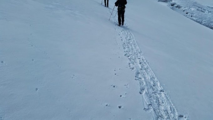 in der Nacht vom 23.08. auf den 24.08. gab es ca. 5cm Neuschnee bis auf 2400m. Dies machte das erkennen der Spalten schwierig. Jedoch lag darunter eine verfestigte Altschneedecke und die Spaltenbrücken waren oft stabil. Es musste eine neue Linie gefunden werden, da die alte Spur zugeschneit war.