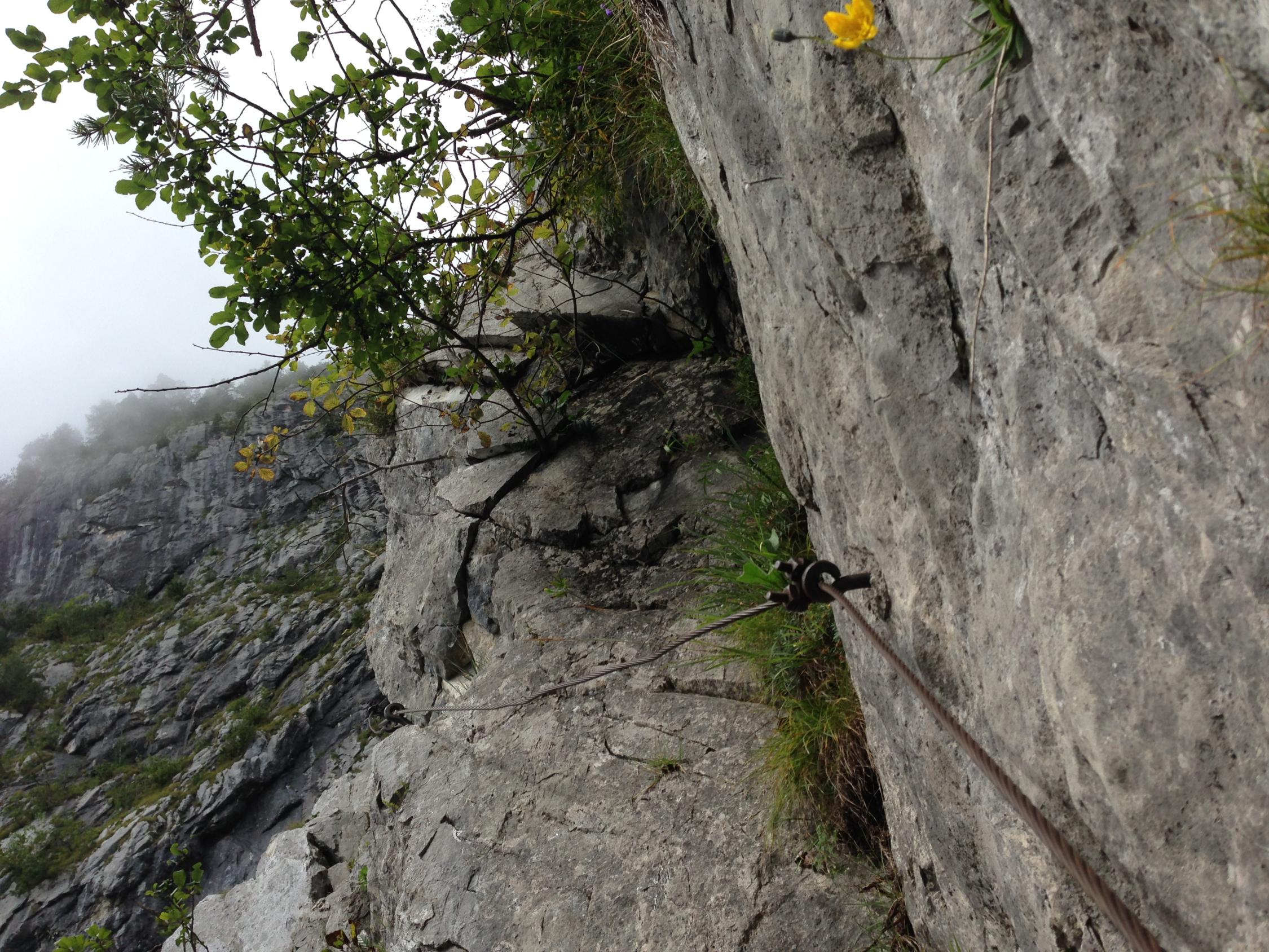 Eine Selbstsicherung am Drahtseil ist wegen teilweise ausgesetzten Stellen ratsam. Auch ein Helm kann wegen der Steinschlaggefahr nicht schaden.