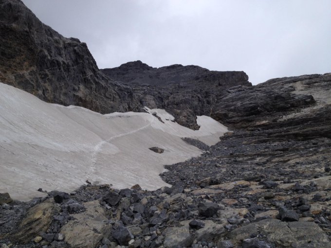Steilstufen/Platten etwas nass, aber ab der Mulde auf 2300m alles trocken. Zwei kleine Altschneefelder/Firn noch vorhanden aber problemlos ohne Steigeisen zu machen (siehe Fotos). Das letzte kleine Schneefeld vor dem Sattel ist ein paar Meter etwas eisig, aber man kann die Stelle umgehen.
