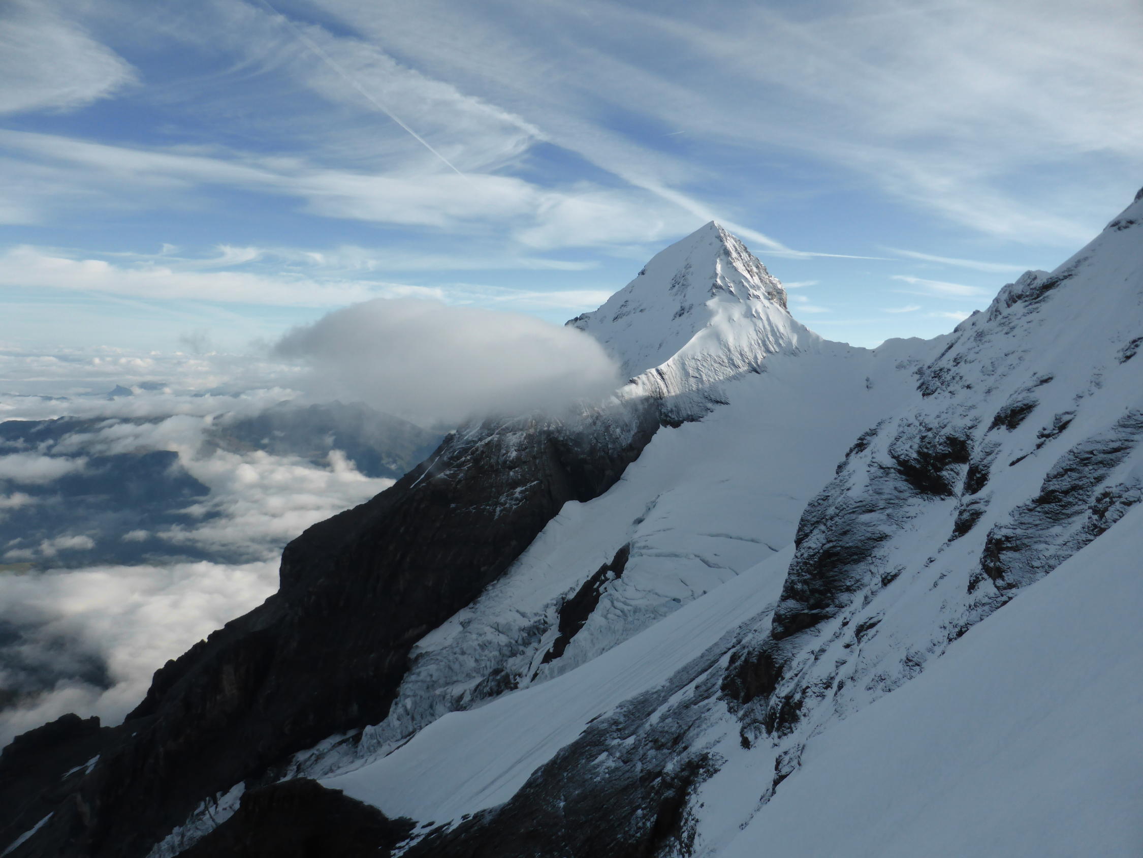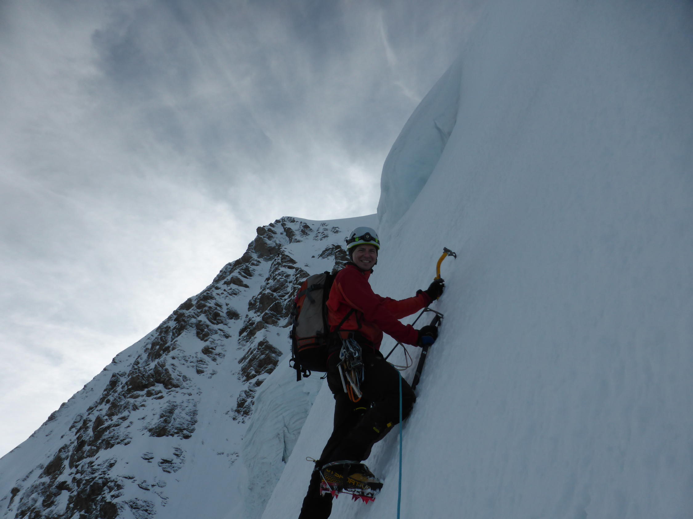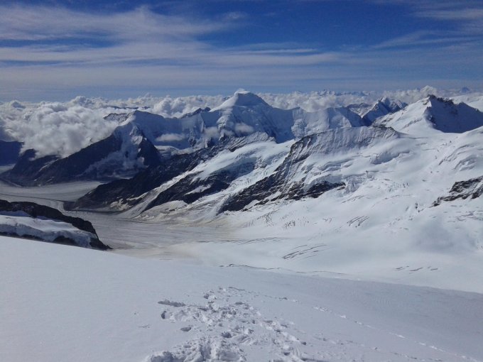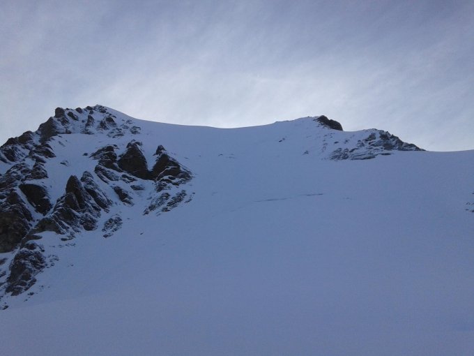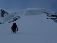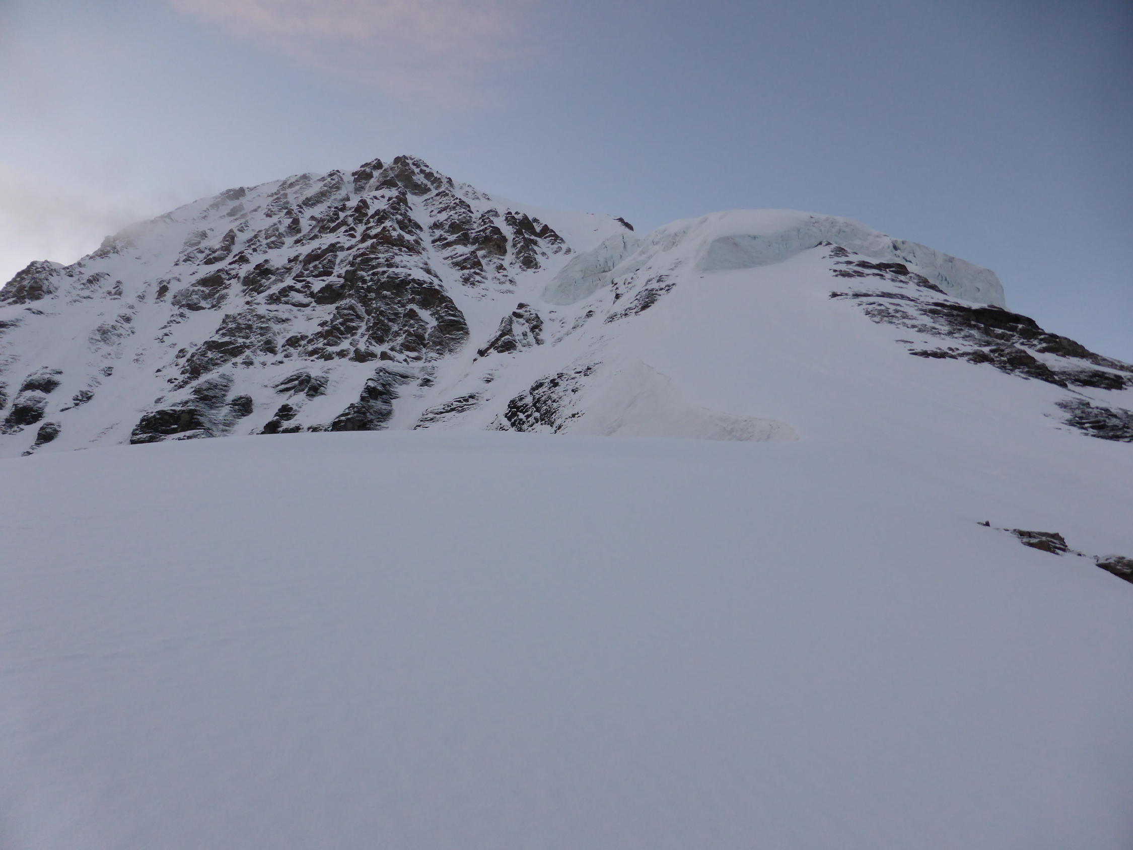 Nollen perfekte Verhältnisse. Wächte am Ende des Nollens rechts umgangen da sehr weich. Auf dem Nollengletscher bis zur Randkluft mühsames Spuren bis Knietief. Wand wieder perfekter Firn.