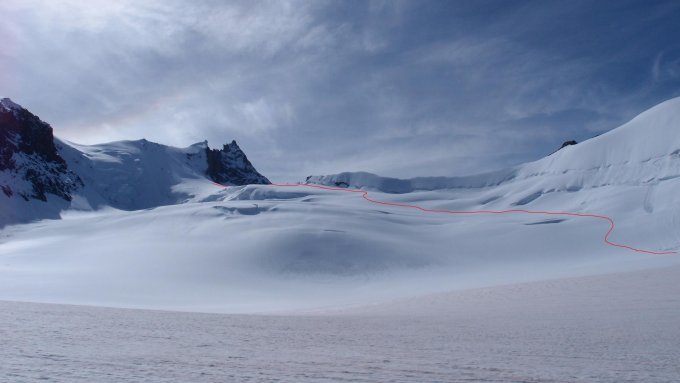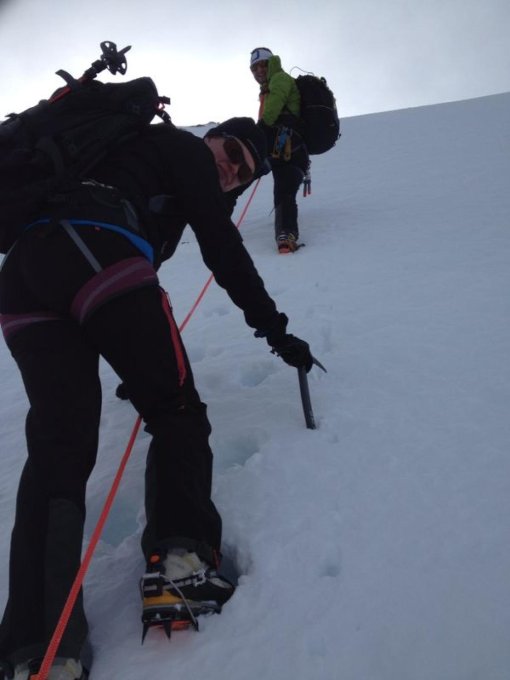 Super Verhältnisse, Spalten gut eingeschneit, perfekter Trittschnee in steilen Firnhang.